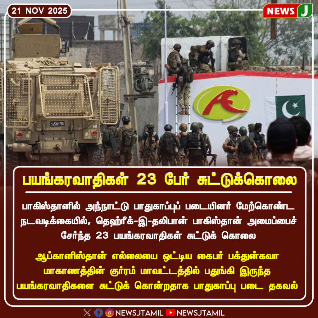 கிஸ்தானின் தெஹ்ரிக்–இ–தாலிபான் அமைப்பு தொடர்புடைய பயங்கரவாதிகள் மறைந்திருந்த இடத்தில் பாதுகாப்புப் படையினர் திடீர் நடவடிக்கை மேற்கொண்டதால் கடும் துப்பாக்கிச்சண்டை ஏற்பட்டது. பல மணி நேர மோதலுக்குப் பிறகு 23 பயங்கரவாதிகள் சுட்டுக்கொல்லப்பட்டதாக தகவல் வெளியாகியுள்ளது.