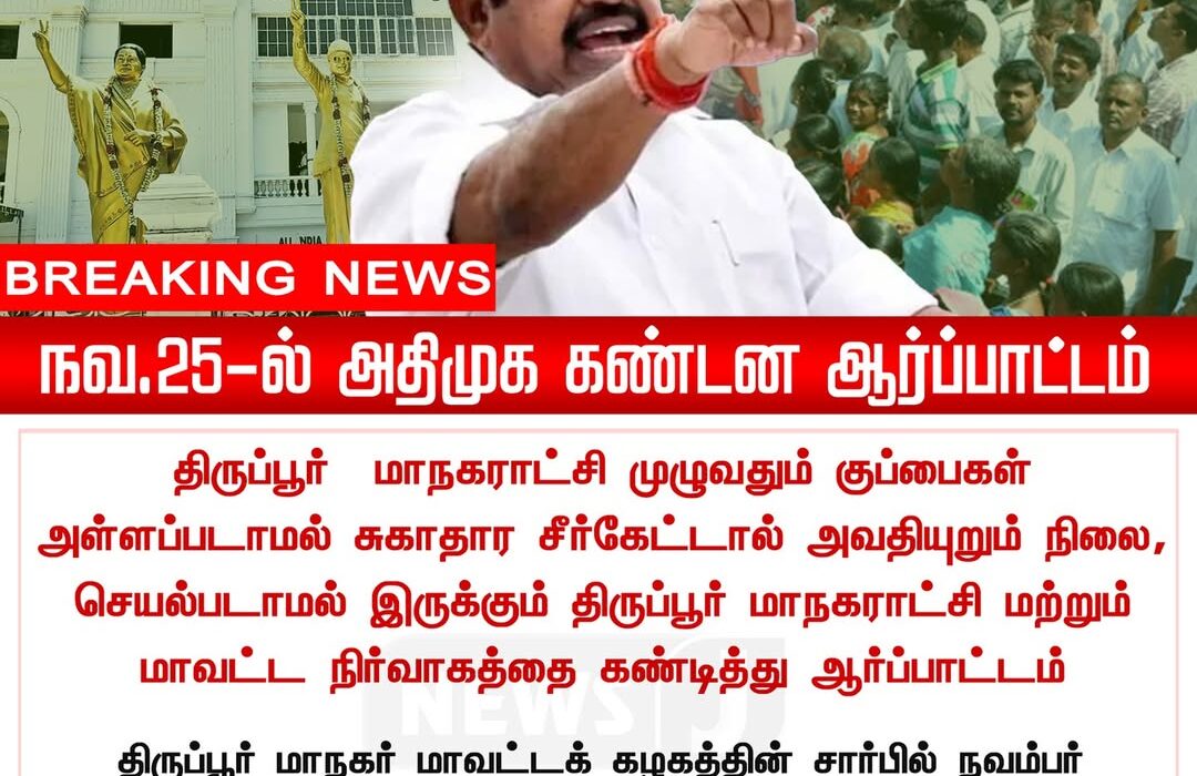 திருப்பூர் மாநகராட்சி பகுதிகளில் குடிமக்கள் எதிர்கொள்ளும் குப்பை மேலாண்மை சிக்கல்கள் மற்றும் அடிப்படை வசதிகளின் குறைவை எதிர்த்து அதிமுக வலுவான கண்டன ஆர்ப்பாட்டம் நடத்த இருப்பதாக அறிவிக்கப்பட்டுள்ளது.