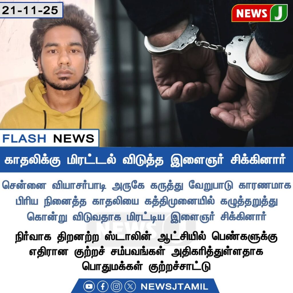 சென்னை வியாசர்பாடி பகுதியில் வசிக்கும் வீரபாண்டி என்ற இளைஞர், அறிமுகமான பெண் தனது காதலை ஏற்கவில்லை என்ற கோபத்தில் கத்தியுமூலம் மிரட்டியதாக போலீசாருக்கு புகார் அளிக்கப்பட்டது. புகார் அடிப்படையில் உடனடி விசாரணை நடந்து, இளைஞர் கைது செய்யப்பட்டதாக தகவல்.
