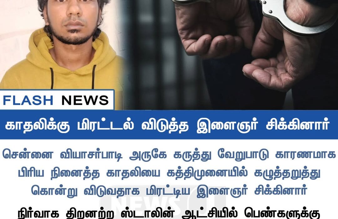 In Vyasarapadi, Chennai, a young man named Veerapandi allegedly threatened a woman with a knife after she refused his proposal. Based on the complaint, the police conducted an immediate inquiry and arrested the accused.
