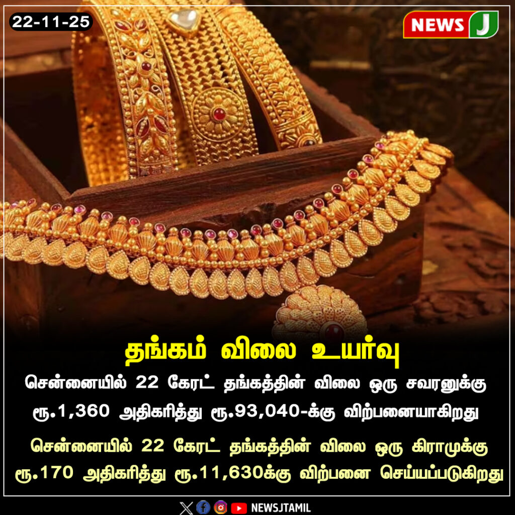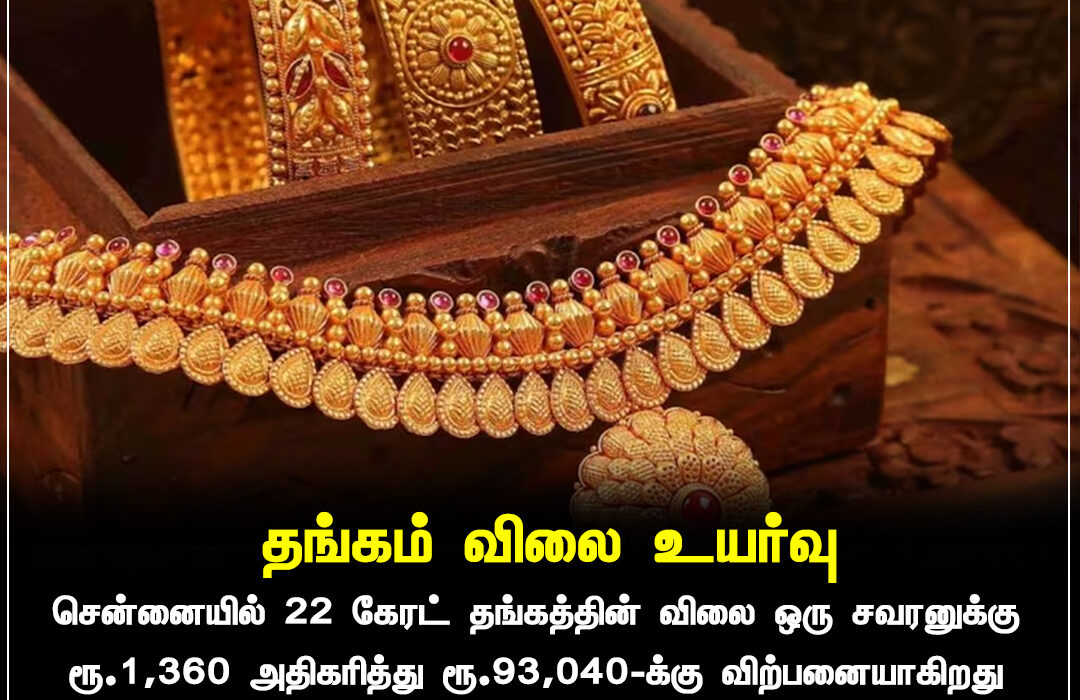 In Chennai, today the price of 22-carat jewellery gold has increased by ₹1,360 per sovereign, reaching ₹93,040. Traders say the rise began from the early morning session due to increased purchase demand.