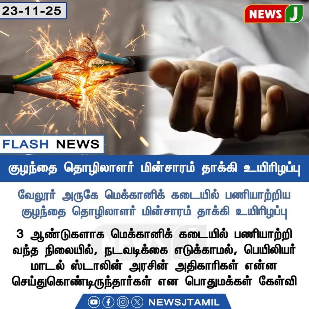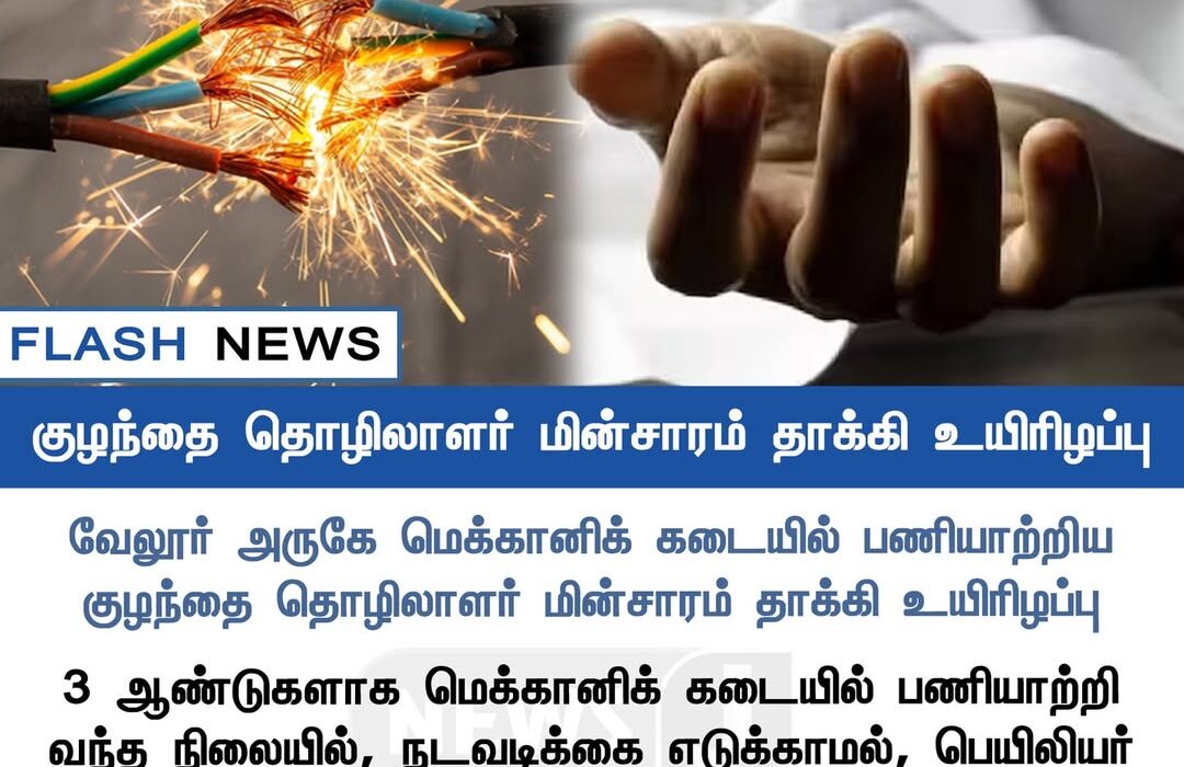 வேளூர் அருகே உள்ள மெக்கானிக் கடையில் பணியாற்றிய 13 வயது சிறுவன், மின்கம்பிகளை சரிசெய்ய முயன்றபோது மின்சாரம் தாக்கி சம்பவ இடத்திலேயே உயிரிழந்தது பெரும் சோகத்தை ஏற்படுத்தியுள்ளது.