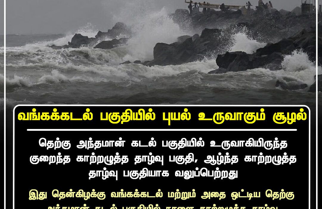 வங்கக்கடலின் தெற்கு பகுதிகளில் உருவாகியுள்ள காற்றழுத்த தாழ்வு, அடுத்த 48 மணி நேரத்தில் புயலாக வலுப்பெறும் வாய்ப்புள்ளதாக வானிலை ஆய்வு மையம் தெரிவித்துள்ளது. காற்றழுத்த தாழ்வு வடக்கு அண்டமான் கடல் பகுதிக்குத் தொடர்ந்து நகர்ந்து தீவிரமாகும் நிலையில் உள்ளது.