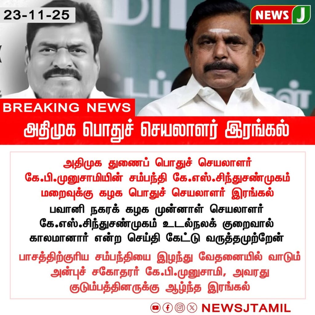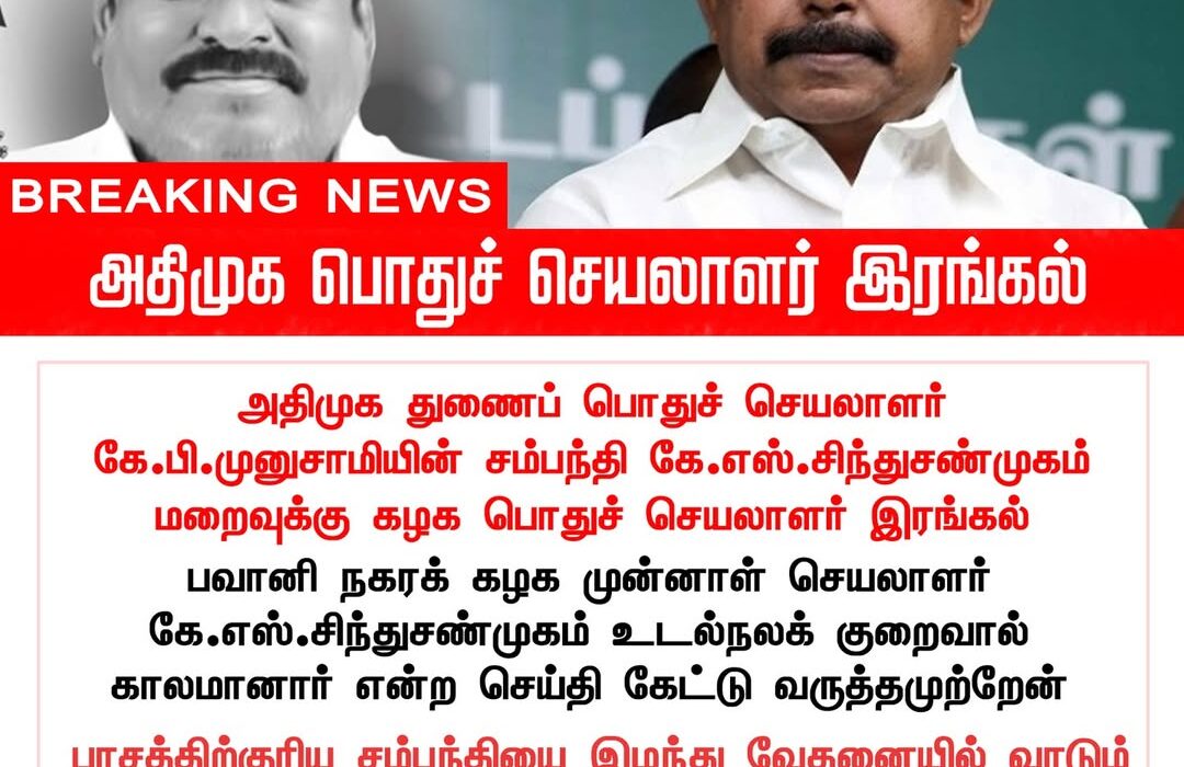 In Tamil Nadu, the passing of KS Sindhusanmugam, former Bhavani Nagar AIADMK union secretary, has led to a note of condolence from Opposition Leader Edappadi K. Palaniswami. The demise reportedly followed a period of health complications.