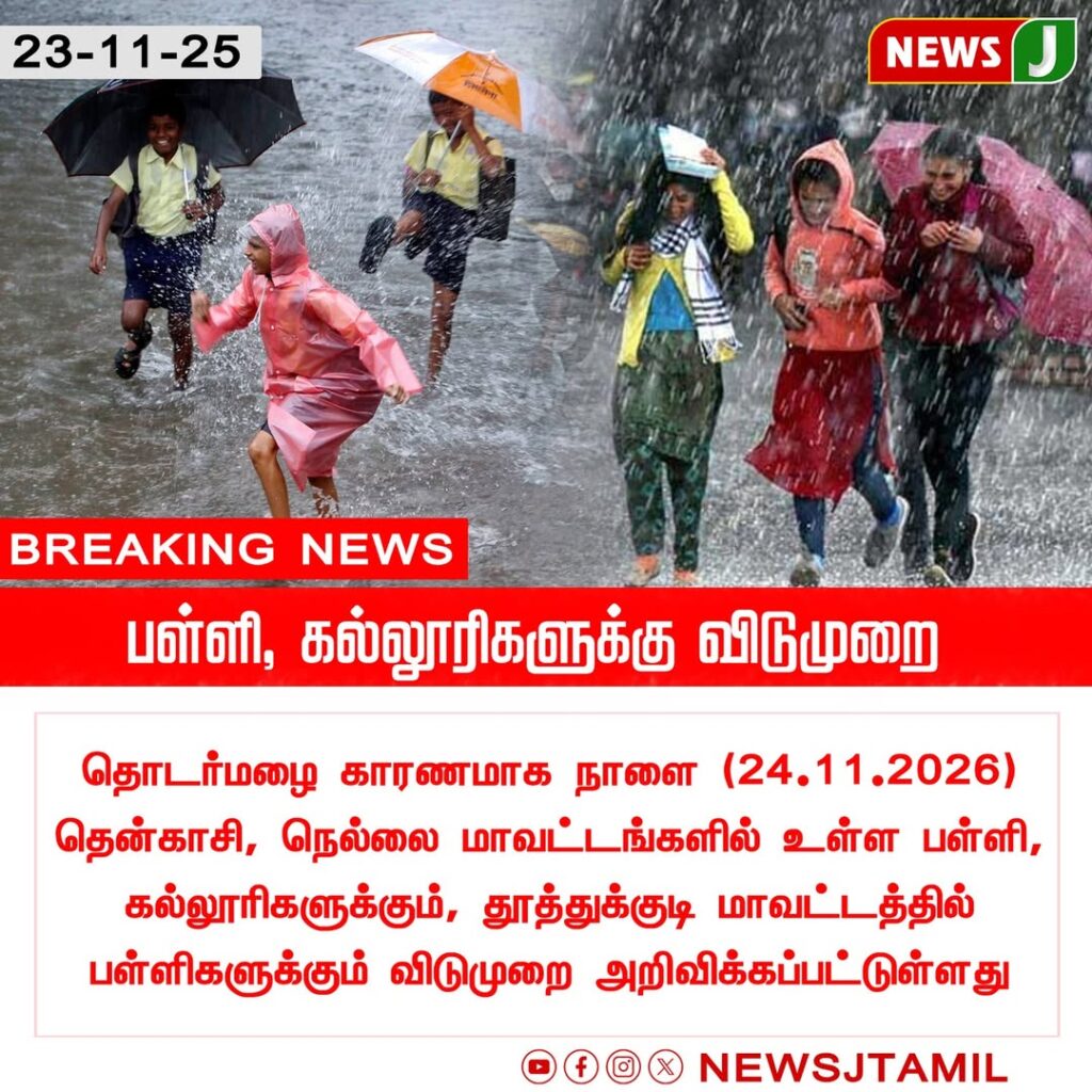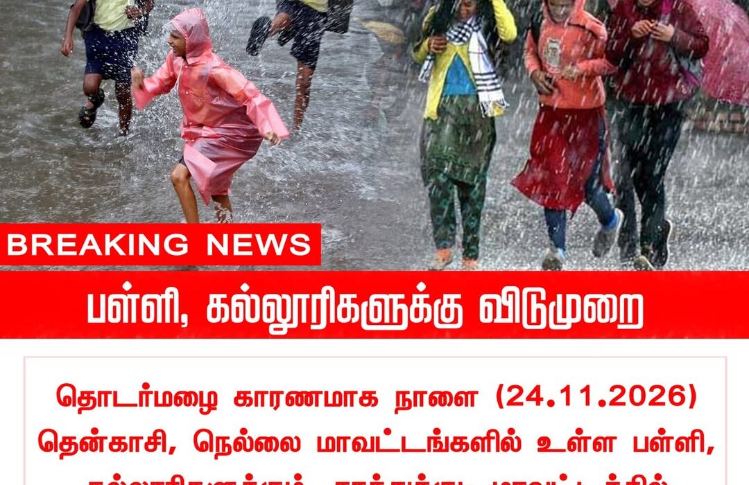 Due to persistent heavy rainfall in Tenkasi and Nellai districts, the district administrations have announced a holiday on November 24, 2026, for all government and private schools & colleges as a precautionary measure.