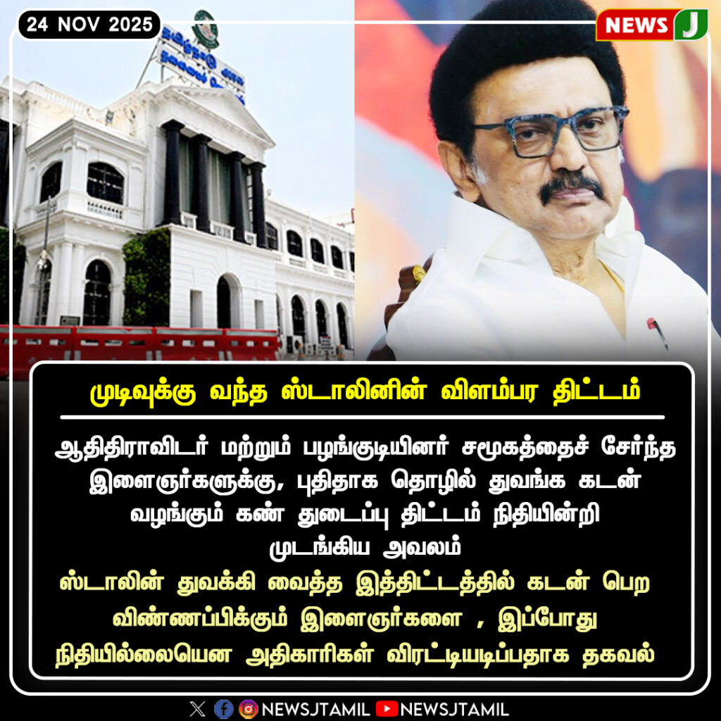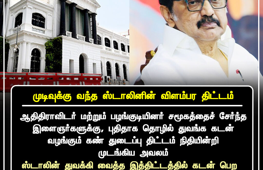 சென்னையில் நவம்பர் 24 அறிவிப்பின் போது, முதல்வர் ஸ்டாலின் ஆதிதிராவிடர் மற்றும் புறக்குழுவினர் சமூகத்துக்கு நீண்டகால நிவாரணமாக புதிய கடன் தள்ளுபடி திட்டத்தை வெளியிட்டார். இத்திட்டம் மூலம் தொழில், கல்வி, மருத்துவம் உள்ளிட்ட காரணங்களுக்காக எடுத்த கடன்கள் முழுமையாக தள்ளுபடி செய்யப்படும் என்று அரசு தெரிவித்துள்ளது.