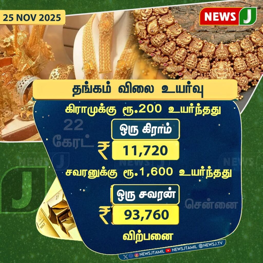 தமிழகத்தில் 25 நவம்பர் 2025 காலை நிலவரப்படி தங்கம் விலையில் மீண்டும் உயர்வு பதிவாகியுள்ளது. 22-கேரட் தங்கத்தின் கிராம் விலை ரூ.200 உயர்ந்துள்ளது. ஒரு கிராமுக்கு ரூ.11,720 என விலை நிர்ணயம் செய்யப்பட்டுள்ளது.