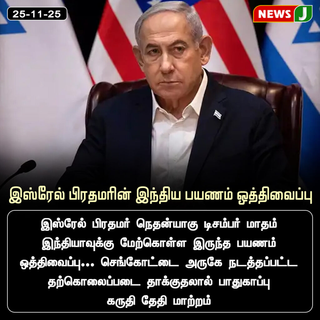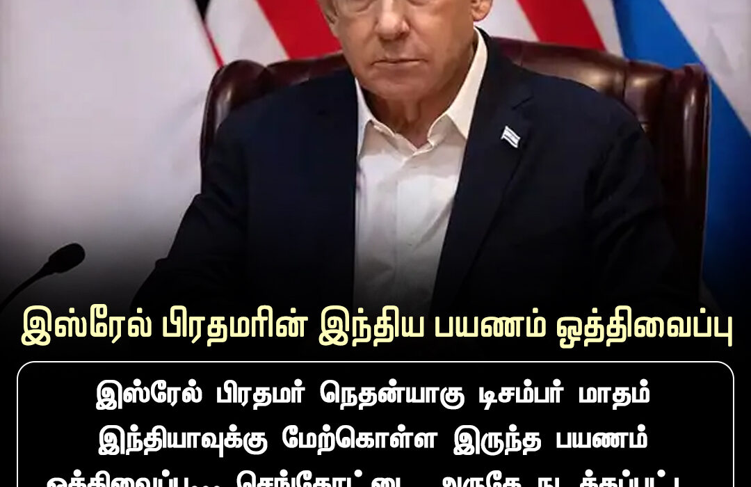 இஸ்ரேல் பிரதமர் பெஞ்சமின் நேதன்யாகு டிசம்பர் மாதம் இந்தியாவுக்கு மேற்கொள்ள இருந்த பயணம் ஒத்திவைக்கப்பட்டுள்ளது. செங்கோட்டையில் நடத்தப்பட்ட தாக்குதலைத் தொடர்ந்து பாதுகாப்பு நிலைமைக்கான ஆய்வுகள் மேற்கொள்ளப்படுவதால் இந்த முடிவு எடுக்கப்பட்டதாக தகவல்கள் தெரிவிக்கின்றன.