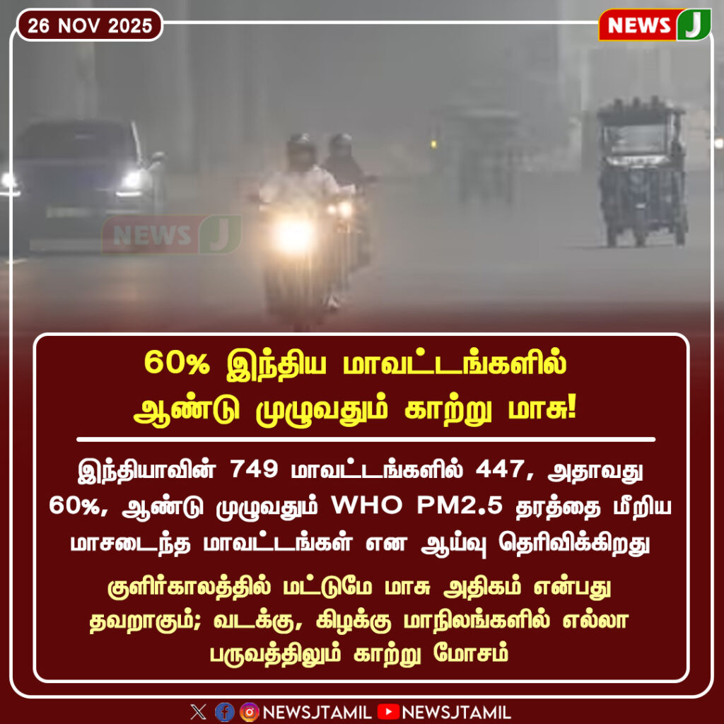இந்தியாவின் 749 மாவட்டங்களில் 447 மாவட்டங்கள் தொடர்ந்து WHO PM2.5 தரத்தைக் கடந்து காற்று மாசில் சிக்கியுள்ளன. வடக்கு, மத்திய மற்றும் கிழக்கு மாநிலங்களில் அதிகமான பகுதிகள் குளிர்காலத்தில் மட்டும் அல்லாமல், முழு ஆண்டும் மாசு மிகுதியால் பாதிக்கப்பட்டுள்ளன.