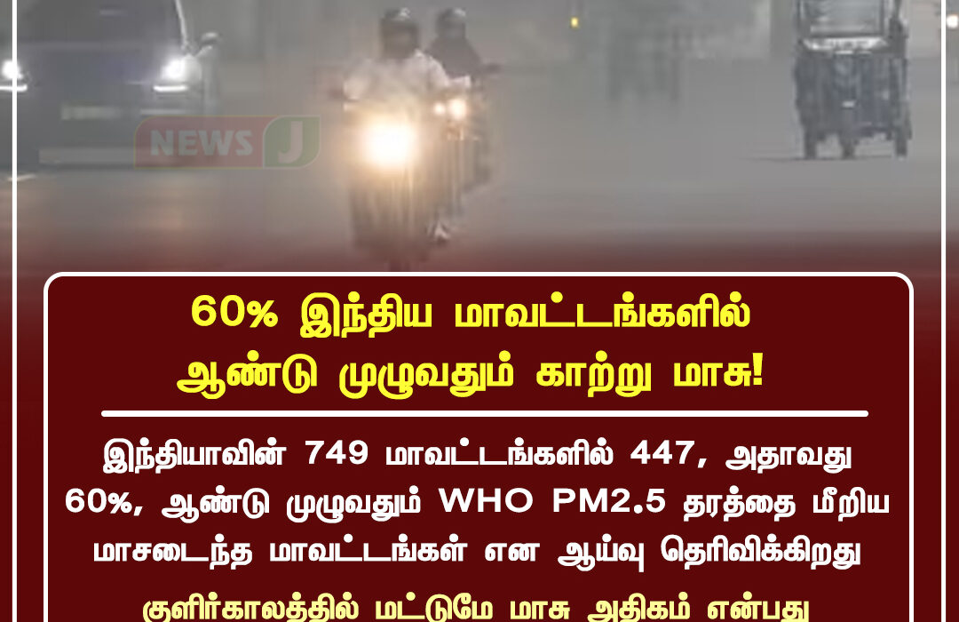 இந்தியாவின் 60% மாவட்டங்கள் ஆண்டு முழுவதும் WHO PM2.5 தரத்தை மீறும் அளவுக்கு காற்று மாசால் பாதிக்கப்பட்டுள்ளன |