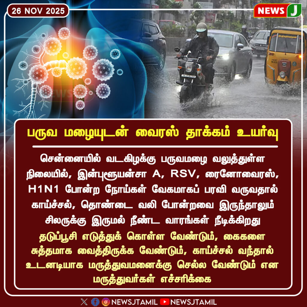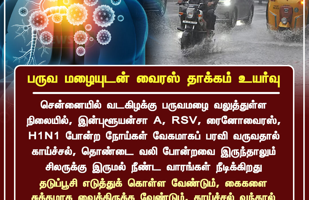 சென்னையில் இடையறாத பருவமழை பெய்துவரும் சூழலில், இன்ஃபுளூயன்சா A, RSV, ரைனோவைரஸ், H1N1 போன்ற வைரஸ் நோய்கள் வேகமாக பரவி வருகின்றன. தொடர்ச்சியான ஈரப்பதம் மற்றும் குளிர் காரணமாக காய்ச்சல், தொண்டை வலி, தலைவலி போன்றவை அதிகமாகக் காணப்படுகின்றன. குறிப்பாக குழந்தைகள் இந்த நிலையில் அதிக பாதிப்புக்குள்ளாகும் என மருத்துவர்கள் எச்சரிக்கின்றனர்.