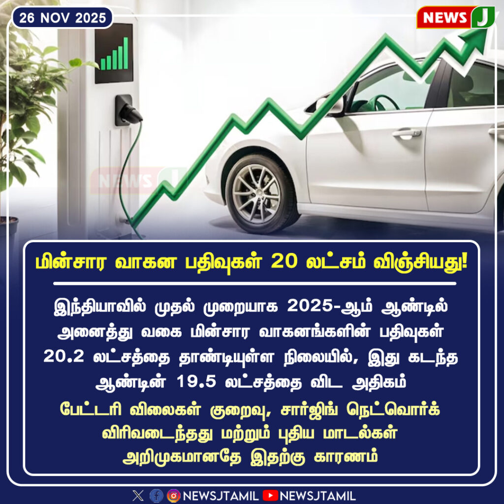 இந்தியாவில் 2025 ஆம் ஆண்டுக்குள் மின்சார வாகனங்களின் பயன்பாடு வேகமாக அதிகரித்து வருகிறது. நாடு முழுவதும் 20.2 லட்சத்திற்கும் அதிகமான EV வாகனங்கள் பதிவு செய்யப்பட்டுள்ளன. இது கடந்த ஆண்டின் 19.5 லட்சத்தை விட குறிப்பிடத்தக்க உயர்வாகும்.
