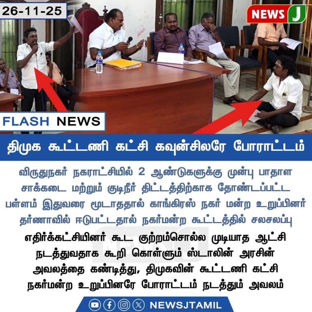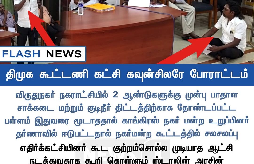 விருதுநகர் நகராட்சியில் இரண்டு ஆண்டுகளாக நிலுவையில் உள்ள பாதுகாப்பு சாக்கடை மற்றும் குடிநீர் திட்டங்களின் தாமதம் குறித்து உள்ளூர் மக்கள் பல முறை மனுக்கள் அளித்திருந்தாலும் தீர்வு கிடைக்கவில்லை. இதனால், நகர்மன்ற கூட்டத்தில் அதிமுக உறுப்பினர் திடீரென தரையில் அமர்ந்து போராட்டத்தில் ஈடுபட்டதாக தகவல்கள் தெரிவிக்கின்றன.