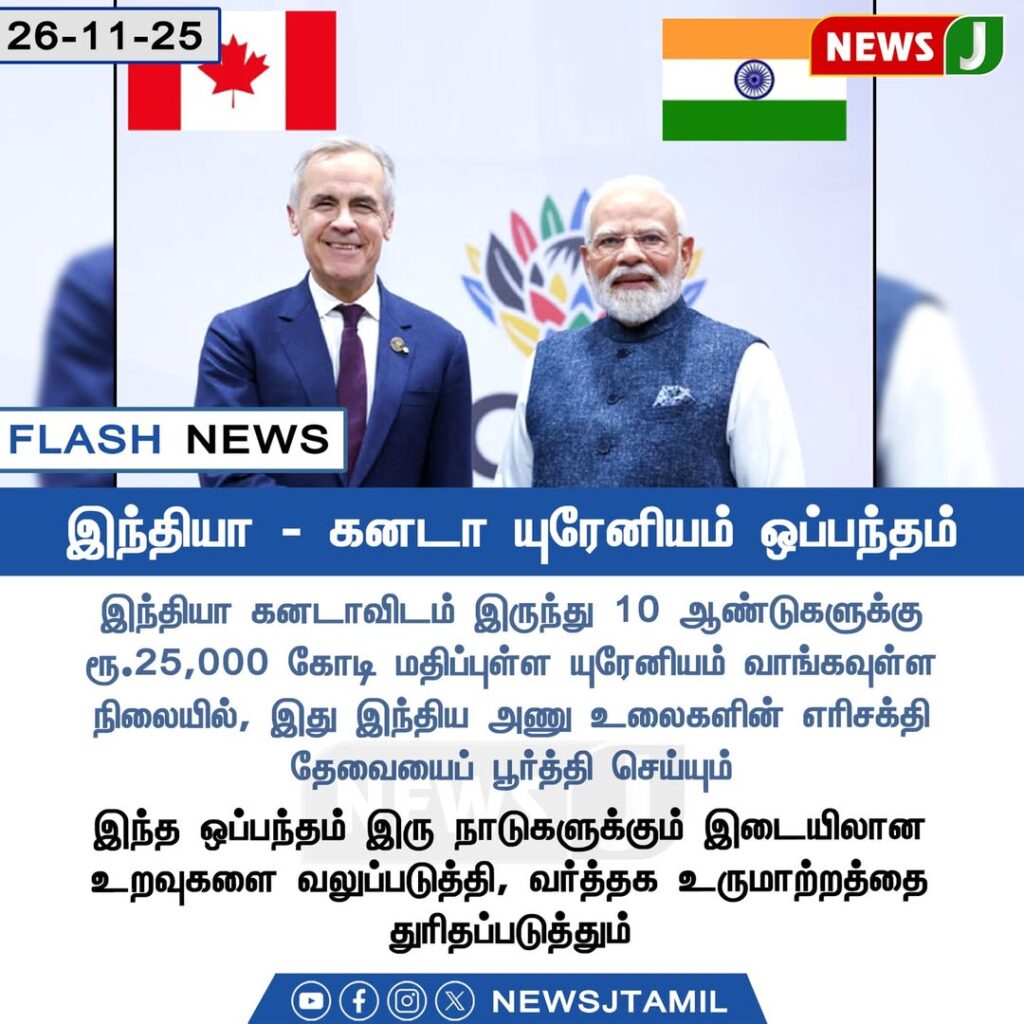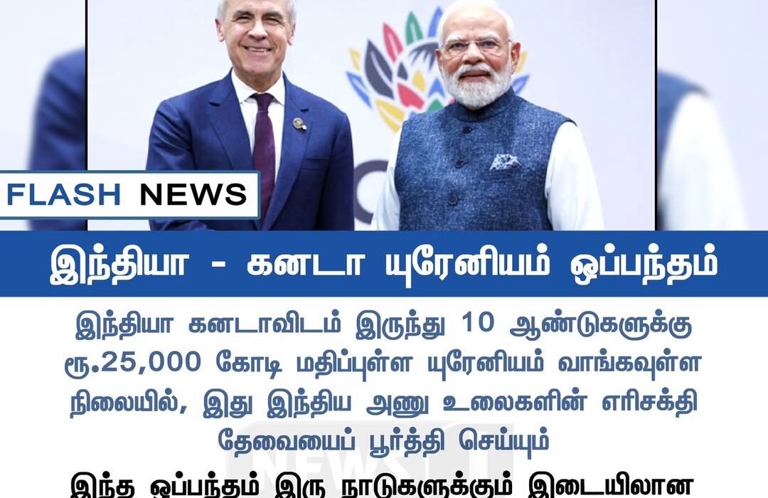 இந்தியா–கனடா இடையில் 10 ஆண்டுகள் ரூ.25,000 கோடி மதிப்புள்ள யூரேனியம் வாங்கும் புதிய ஒப்பந்தம் | New 10-year, ₹25,000-crore Uranium Supply Deal Between India and Canada