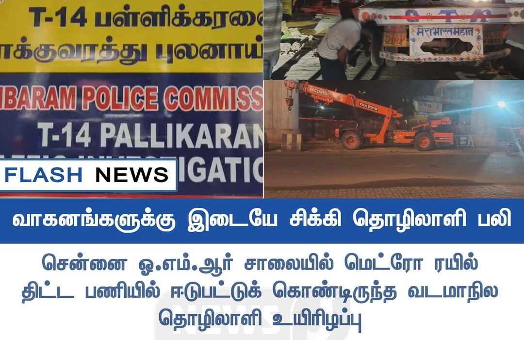 சென்னையின் ஓ.எம்.ஆர் சாலையில் மெட்ரோ ரயில் திட்டப் பணியில் ஈடுபட்டிருந்த வடமாநில தொழிலாளர், இரண்டு வாகனங்களுக்கு இடையில் சிக்கி உயிரிழந்த சம்பவம் பகுதியை அதிர வைத்துள்ளது.