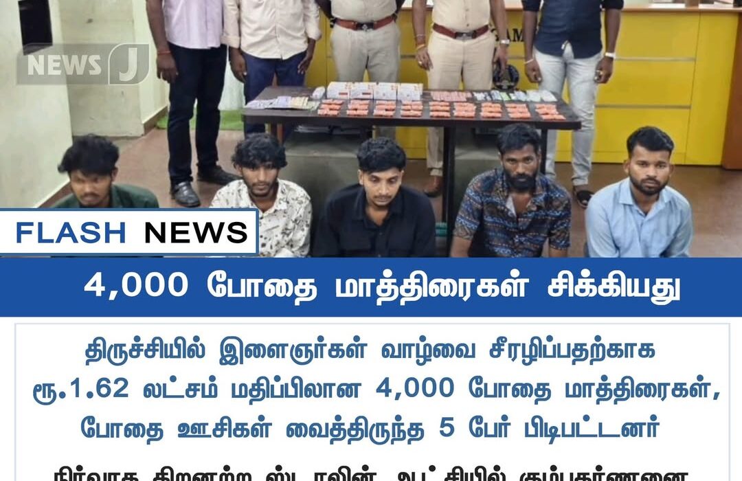 திருச்சியில் இளைஞர்கள் வாழ்வை சீறழிப்பதற்காக ரூ.1.62 லட்சம் மதிப்பிலான 4,000 போதை மாத்திரைகளை ஆன்லைன் மூலம் வாங்கி வந்து விற்பனை செய்ய முயன்ற 5 பேரை போலீசார் பிடித்துள்ளனர். போதை பொருட்களை விநியோகிக்கும் உள்கட்டமைப்பும் சோதனையில் வெளிப்பட்டுள்ளது.