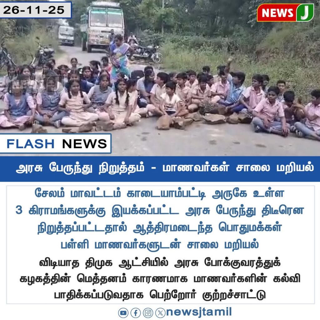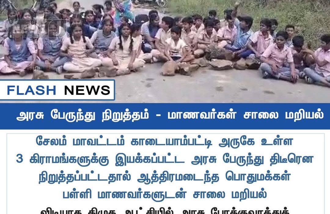 Students in Kadayampatti near Salem staged a road blockade after government bus services to three nearby villages were abruptly suspended. Many schoolchildren had no means of reaching classes, leading to spontaneous protests.