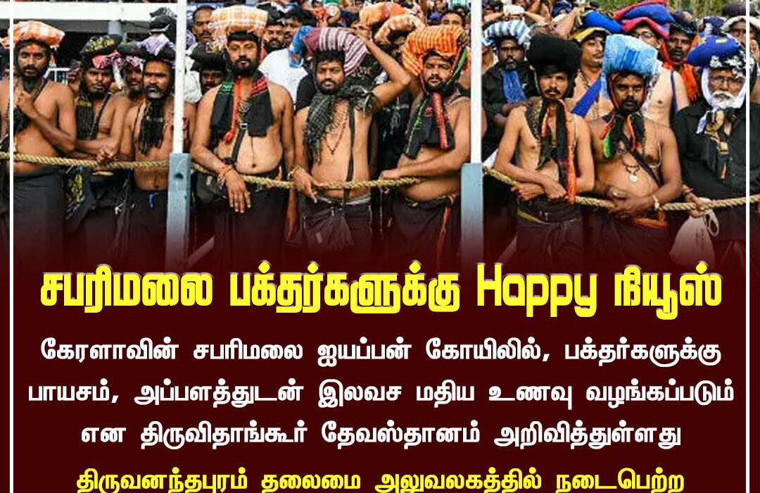 சபரிமலையில் பக்தர்களுக்கு பாயசம், அப்பளத்துடன் இலவச உணவு வழங்கப்படும் என அறிவிப்பு. | Free meals including payasam and appalam will now be provided to Sabarimala devotees.