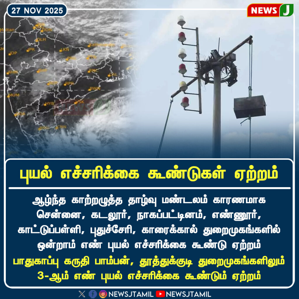 Due to a developing low-pressure system over the Bay of Bengal, cyclone warning signal number 1 has been hoisted at Chennai, Cuddalore, Nagapattinam, Ennore, Kattupalli, Puducherry, and Karaikal ports.