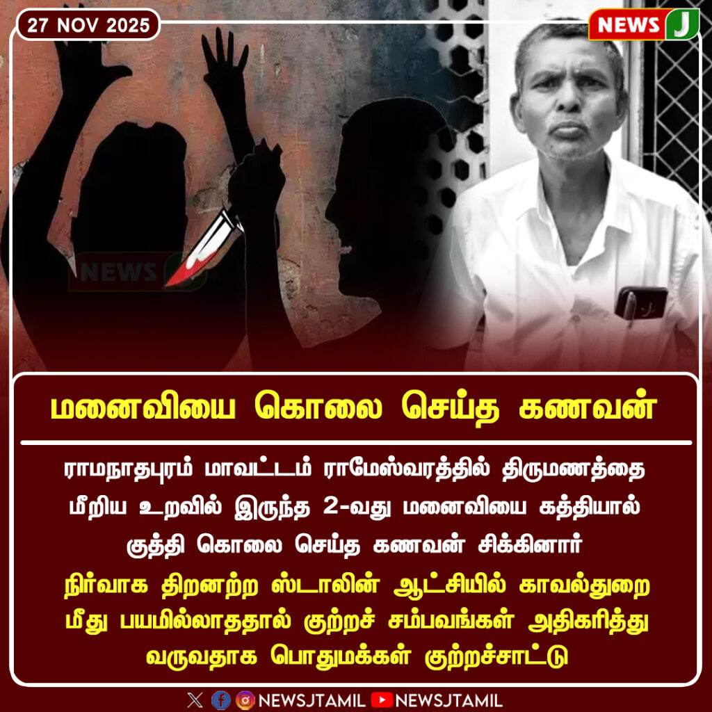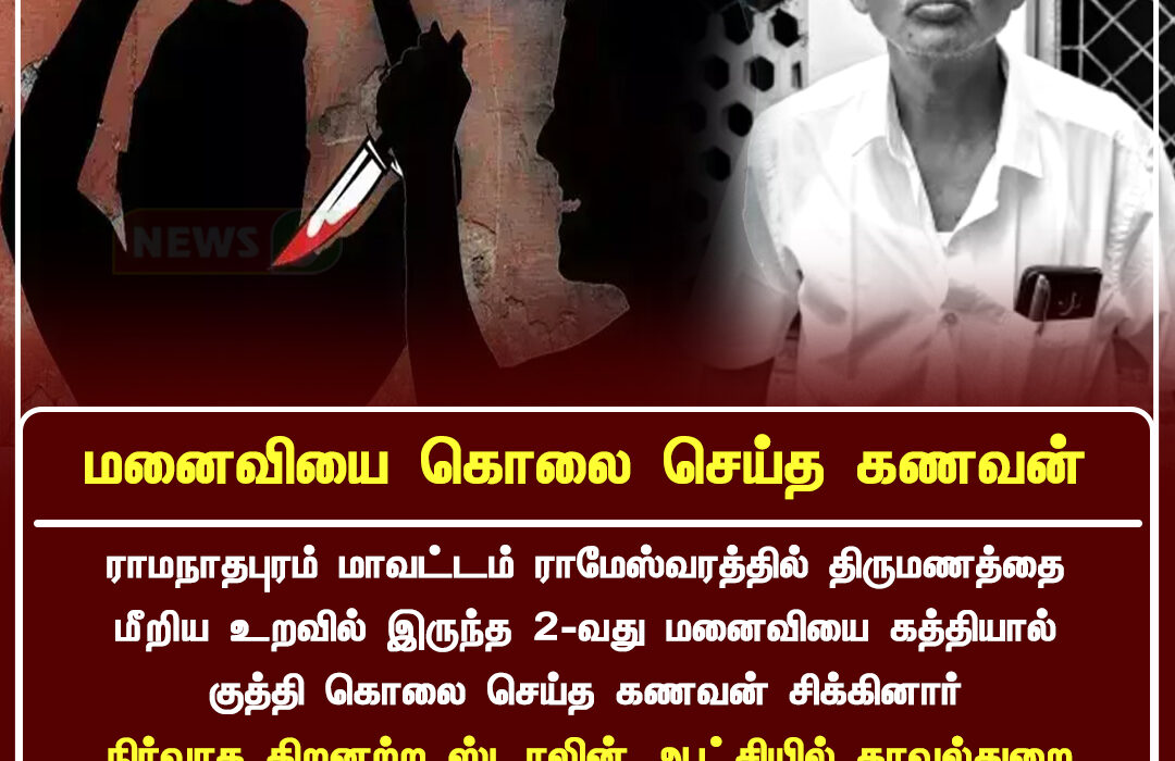 ராமநாதபுரம் மாவட்டம் ராமேஸ்வரத்தில் திருமணத் தகராறில் ஏற்பட்ட கோபத்தால், 자신의 2-வது மனைவியை கத்தியால் குத்திக் கொலை செய்த கணவன் போலீசாரால் கைது செய்யப்பட்டார்.