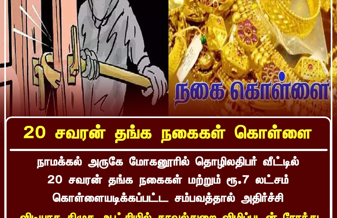 நாமக்கல் மோகவூரில் தொழிலதிபர் வீட்டில் 20 சவரன் நகைகள் கொள்ளை. | 20 sovereigns of gold stolen from a businessman’s house in Namakkal.