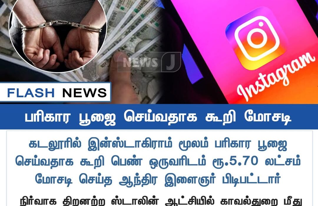 கடலூரில் இன்ஸ்டாகிராம் மூலம் பரிகார பூஜை செய்து தருவதாக கூறி ஒரு பெண்ணிடம் இருந்து ரூ.5.70 லட்சம் பணத்தை மோசடி செய்த இளைஞர் போலீசாரால் கைது செய்யப்பட்டார்.