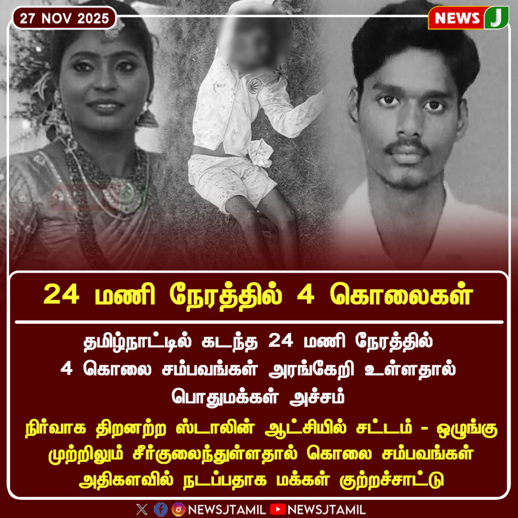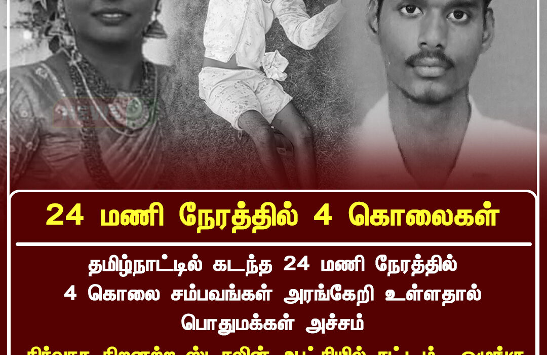 தமிழ்நாட்டில் கடந்த 24 மணி நேரத்தில் நான்கு கொலை சம்பவங்கள் நடந்ததால் பொதுமக்கள் மத்தியில் பெரும் அதிர்ச்சி நிலவுகிறது.