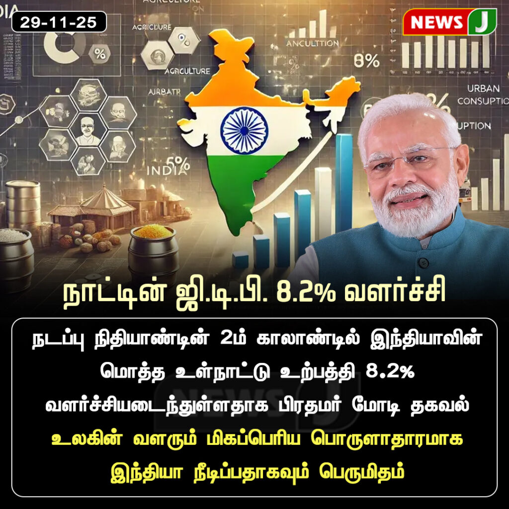 இந்தியாவில் நடப்பு நிதியாண்டின் இரண்டாம் காலாண்டில் 8.2% ஜிடிபி வளர்ச்சி பதிவாகியுள்ளது. இந்த வளர்ச்சி விகிதம், உலகின் மிகப்பெரிய பொருளாதாரங்களில் இந்தியா தொடர்ந்து முன்னிலை வகிக்கிறது என்பதை உறுதிப்படுத்துகிறது.