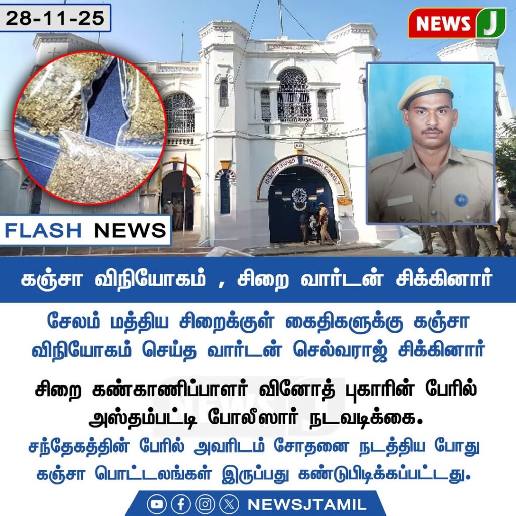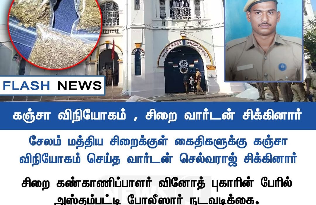 சேலம் மத்திய சிறையில் கைதிகளுக்கு கஞ்சா வழங்கியதாக குற்றம்சாட்டப்பட்ட சிறை வார்டன் செல்வராஜ் சம்பவத்தில் கைது செய்யப்பட்டார்.