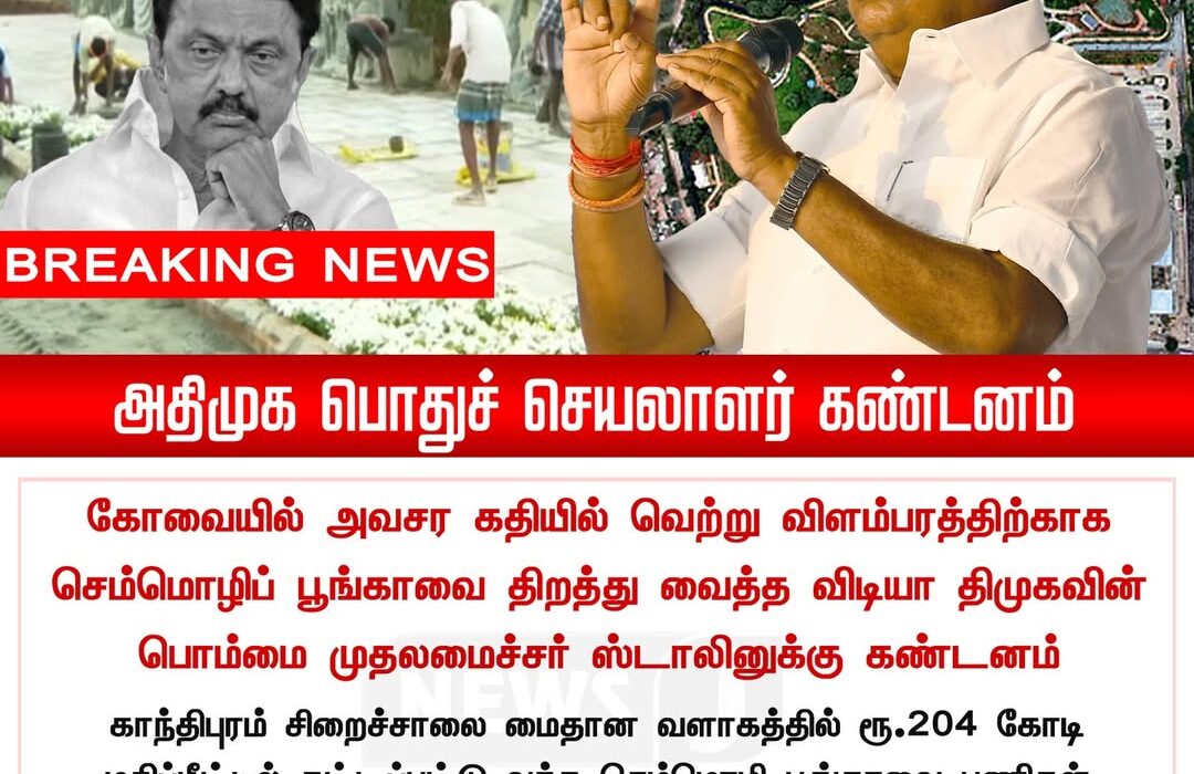 கோவை அவசர கதி பகுதியில் வெற்றுவீட்டுப் புனரமைப்பிற்காக அமைக்கப்பட்ட セம்மொழிப் பூங்காவில் திமுக அரசு மேற்கொண்ட செயல்பாடுகளை எதிர்த்து அதிமுக பொதுச் செயலாளர் ஸ்டாலினுக்கு எதிராக கடும் கண்டனம் தெரிவிக்கப்பட்டுள்ளது.