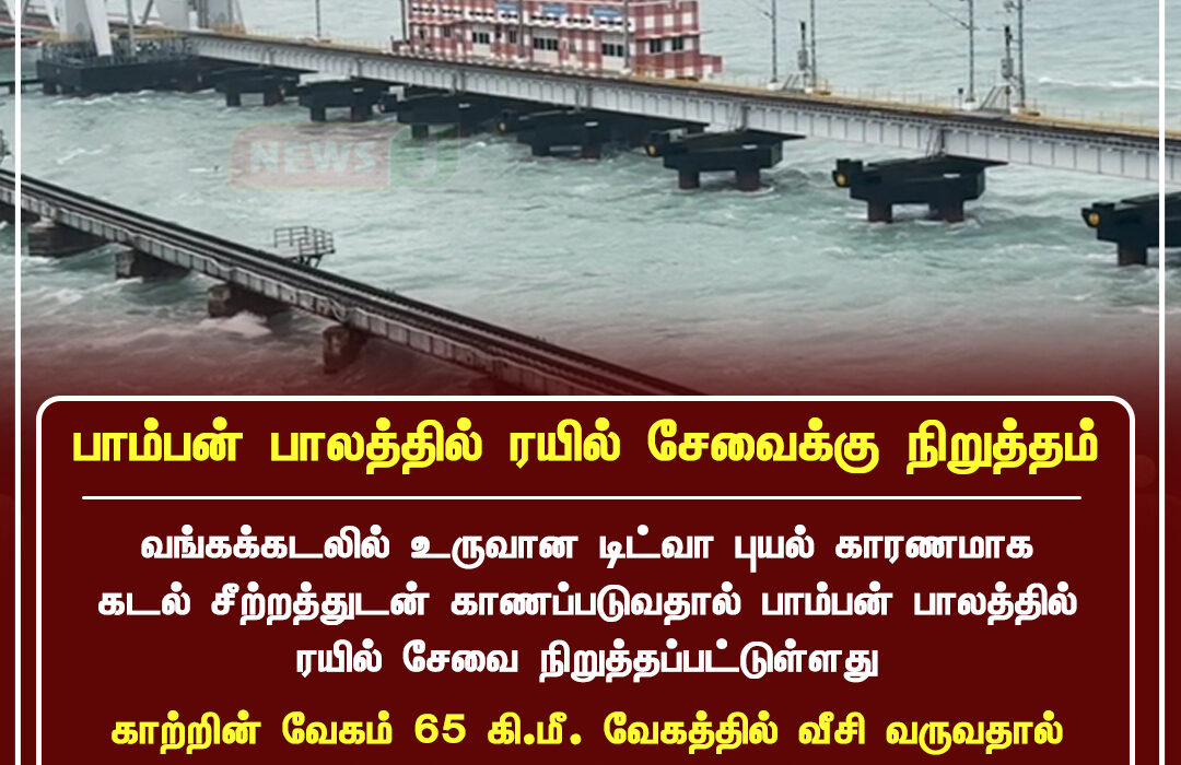 Due to the intensified Titva cyclone effect over the Bay of Bengal, sea waves near Pamban Bridge rose significantly, prompting authorities to halt train services on the bridge as a safety precaution. Railway officials confirmed that services have been suspended temporarily to avoid any risk.
