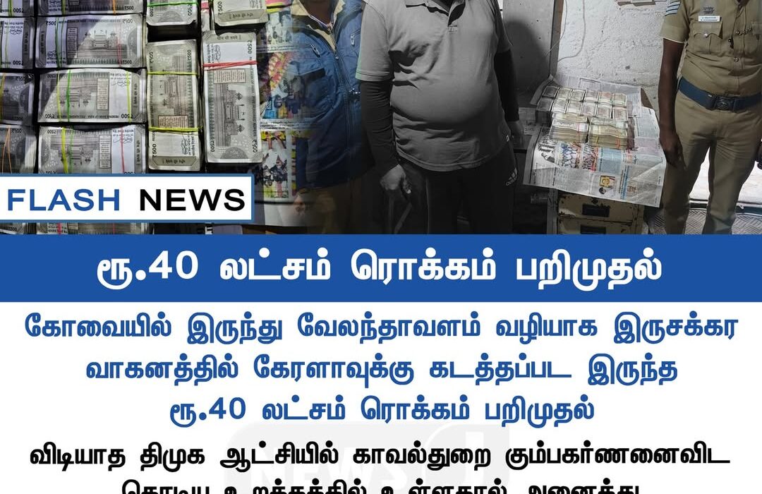கோவை மாவட்டம் வேலந்தவளம் பகுதியில் வழியாக சென்றிருந்த ஒரு இருசக்கர வாகனத்தை காவல்துறையினர் நிறுத்திச் சோதனை மேற்கொண்டபோது, சந்தேகத்திற்கிடமாக இருந்த பைகளில் ரூ.40 லட்சம் ரொக்கம் இருப்பது கண்டுபிடிக்கப்பட்டது. பணத்தின் மூலமும் நோக்கமும் தெளிவாக விளக்கப்படாததால், காவல்துறையினர் அதை பறிமுதல் செய்தனர்.