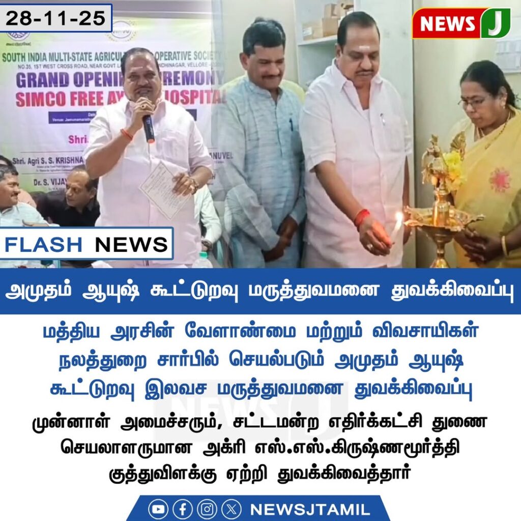 சென்னையில் மத்திய அரசின் வேலைவாய்ப்பு மற்றும் விசாயிகள் நலத்துறை சார்பில் செயல்படும் அமுதம் ஆயுஷ் கூட்டுறவு இலவச மருத்துவமனை இன்று (28 நவம்பர் 2025) திறக்கப்பட்டது. பொதுமக்களுக்கு குறைந்த செலவில் தரமான சிகிச்சை வழங்குவது இந்த மையத்தின் நோக்கமாக அறிவிக்கப்பட்டுள்ளது.