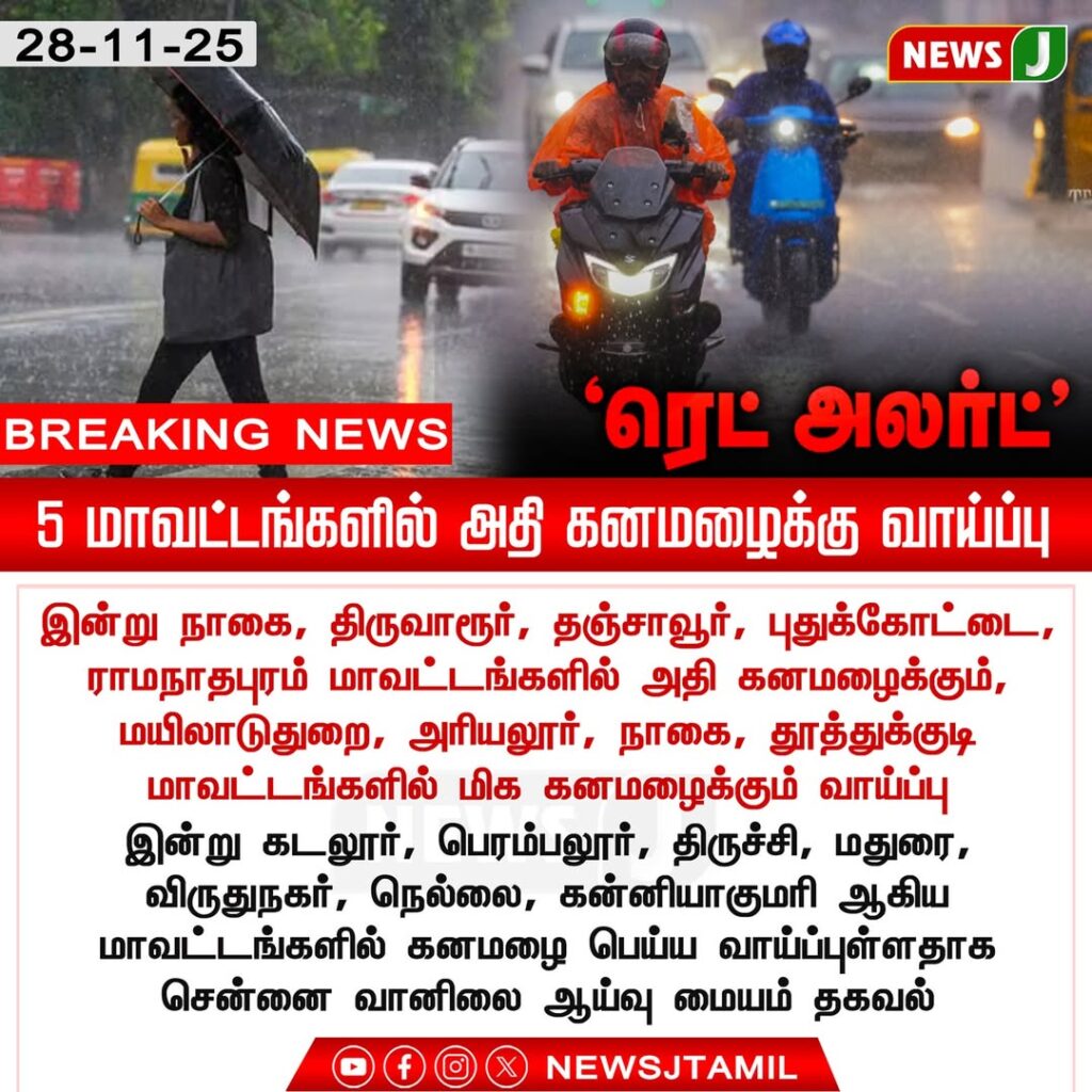 A red alert has been announced as very heavy rainfall is likely today in Nagapattinam, Tiruvarur, Thanjavur, Pudukkottai and Ramanathapuram districts. The weather agency warns of thunderstorms, strong winds and intense showers across coastal areas.