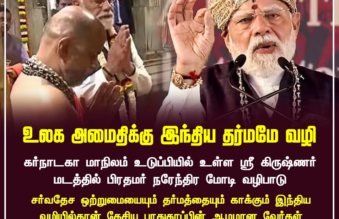 உடுப்பியில் நடைபெற்ற உரையின்போது பிரதமர் நரேந்திர மோடி, இந்திய தர்மத்தின் ஆன்மீக அடிப்படைகளே உலக அமைதிக்கான நிலையான தீர்வாக உள்ளன என வலியுறுத்தினார்.