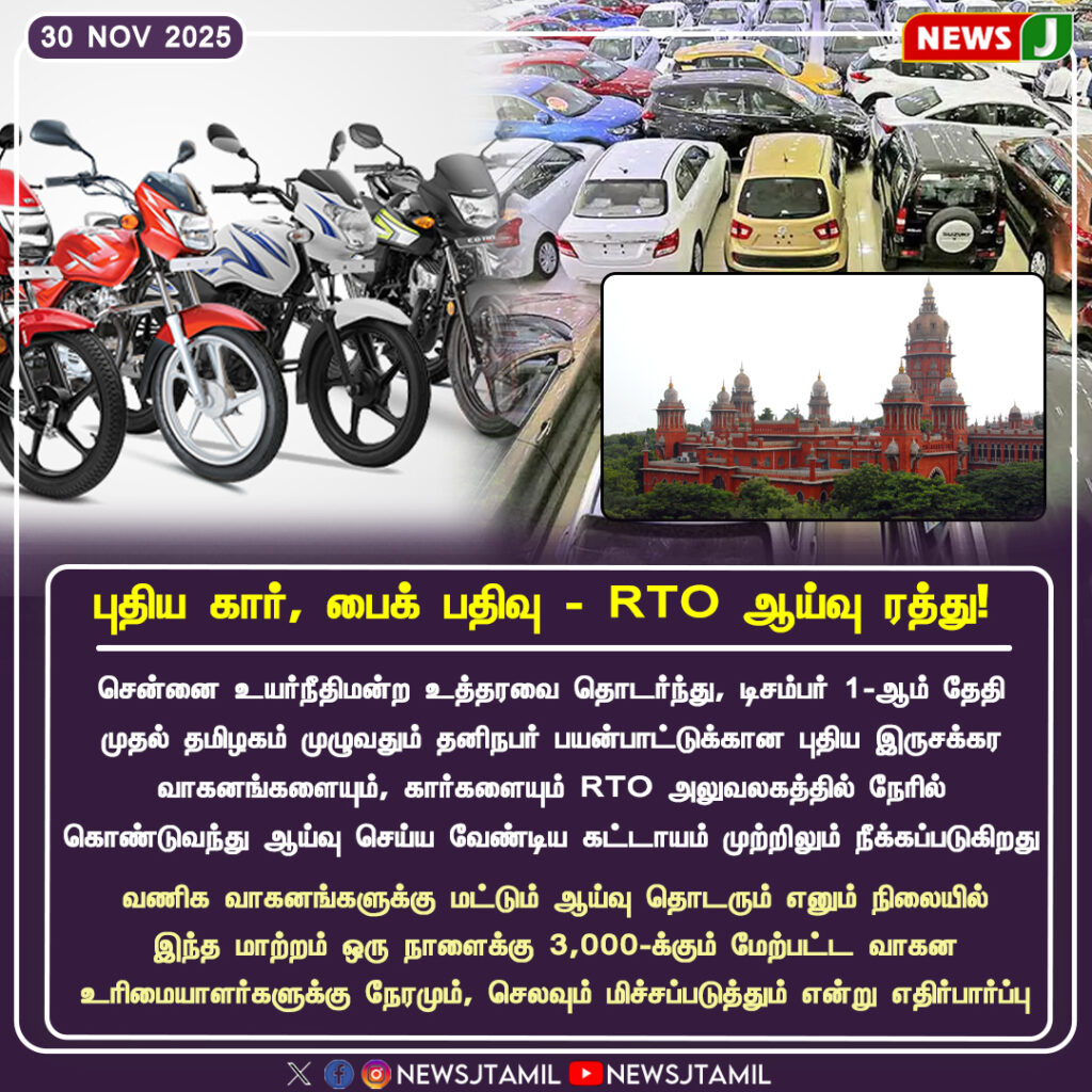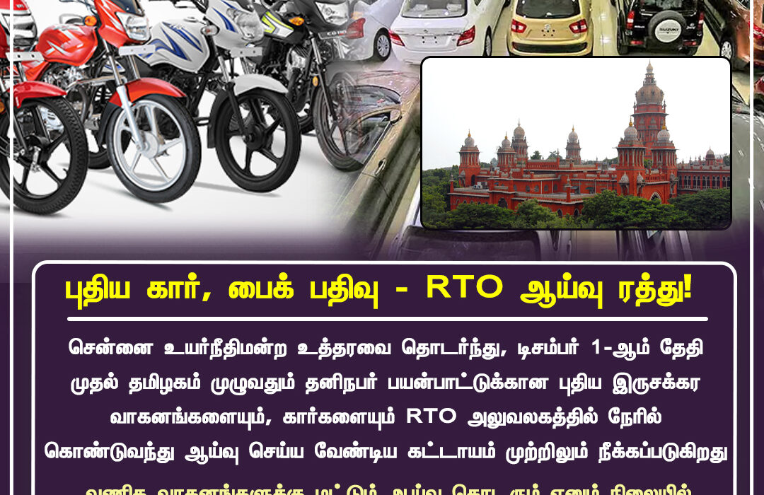 சென்னை உயர்நீதிமன்றத்தின் முக்கிய உத்தரவின் பேரில், டிசம்பர் 1-ஆம் தேதி முதல் தமிழகத்தில் புதிதாக வாங்கப்படும் இருசக்கர வாகனங்கள், நான்கு சக்கர வாகனங்களுக்கு RTO அலுவலகத்தில் நேரில் கொண்டு சென்று ஆய்வு செய்ய வேண்டிய கட்டாயம் நீக்கப்பட்டுள்ளது.