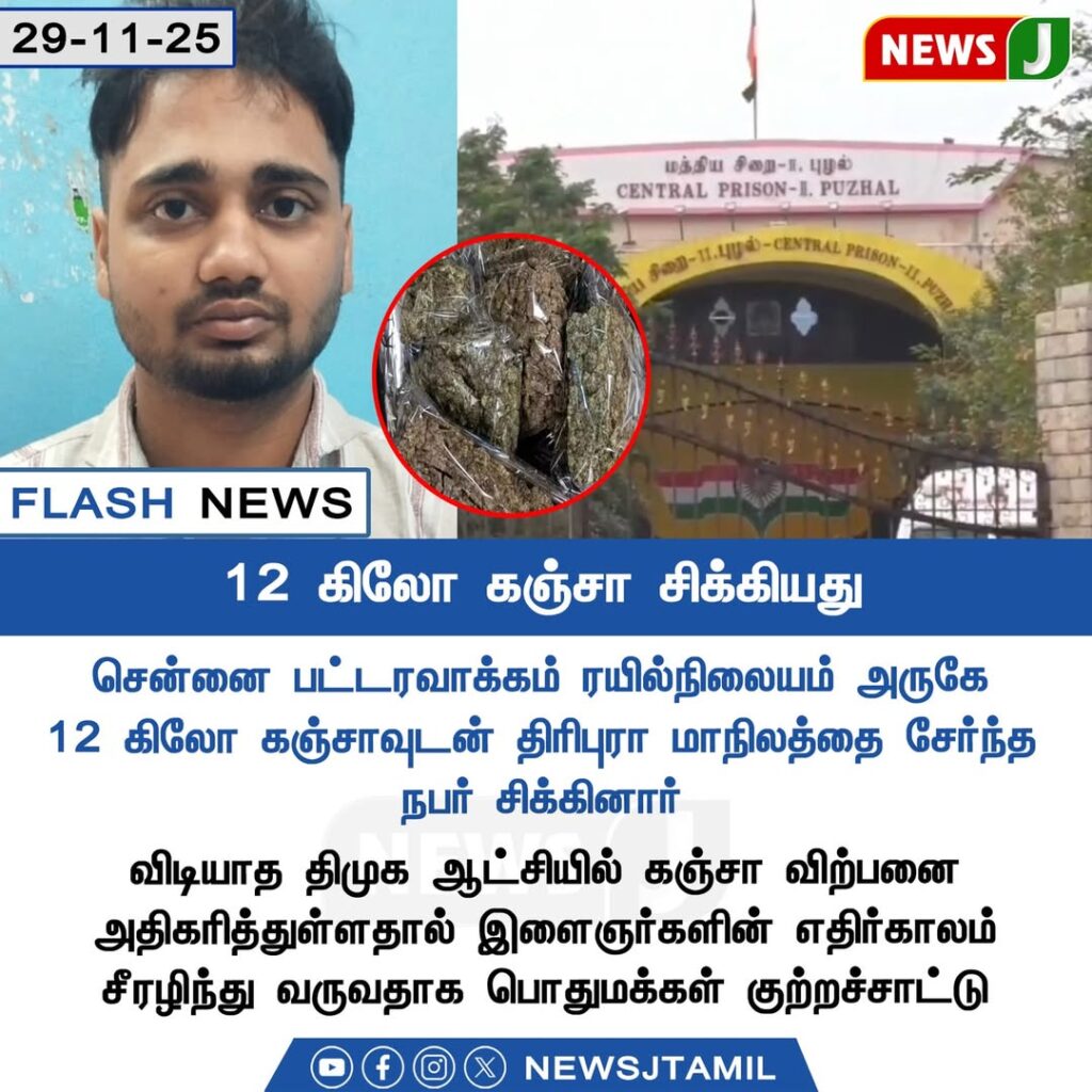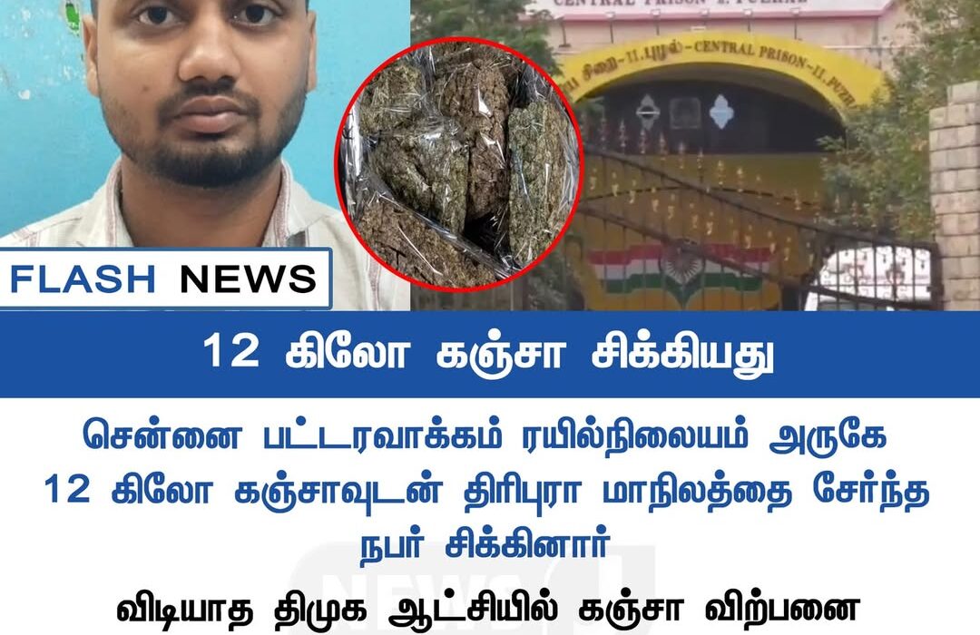 சென்னை புழல் ரயில்நிலையத்தை அடுத்த பகுதியில் கஞ்சா குறித்த பெரிய பிடிப்பு நிகழ்ந்துள்ளது. 12 கிலோ கஞ்சாவுடன் திருப்பூர் மாவட்டத்தை சேர்ந்த நபர் போலீசாரால் கைது செய்யப்பட்டார்.