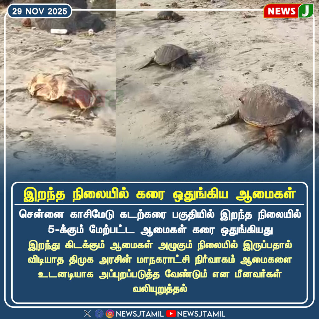 ஆமைகள் அடுக்குமடக்காக இறந்து கரை ஒதுங்குவது சுற்றுச்சூழல் மற்றும் கடல் உயிரியல் கவலையை ஏற்படுத்தியுள்ளதாக தகவல்கள் தெரிவிக்கின்றன. விழியாத திமுக அரசின் மாசுகாரண நீர்வாழை மேலாண்மை துறை உடனடியாக நடவடிக்கை எடுக்க வேண்டுமென மீனவர்கள் கோரிக்கை விடுத்துள்ளனர்.