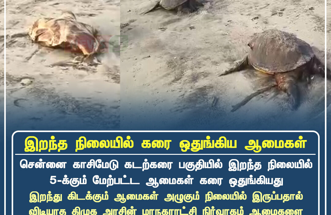 சென்னை காஸிமேடு கடற்கரை பகுதியில் இறந்த நிலையில் 5-க்கும் மேற்பட்ட ஆமைகள் கரை ஒதுங்கியுள்ளன. இதனால் பகுதி மக்கள் மற்றும் மீனவர்கள் அதிர்ச்சியில் உள்ளனர்.
