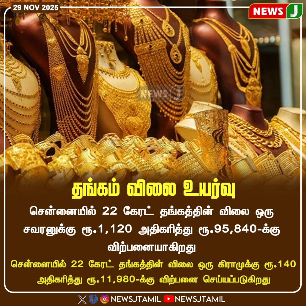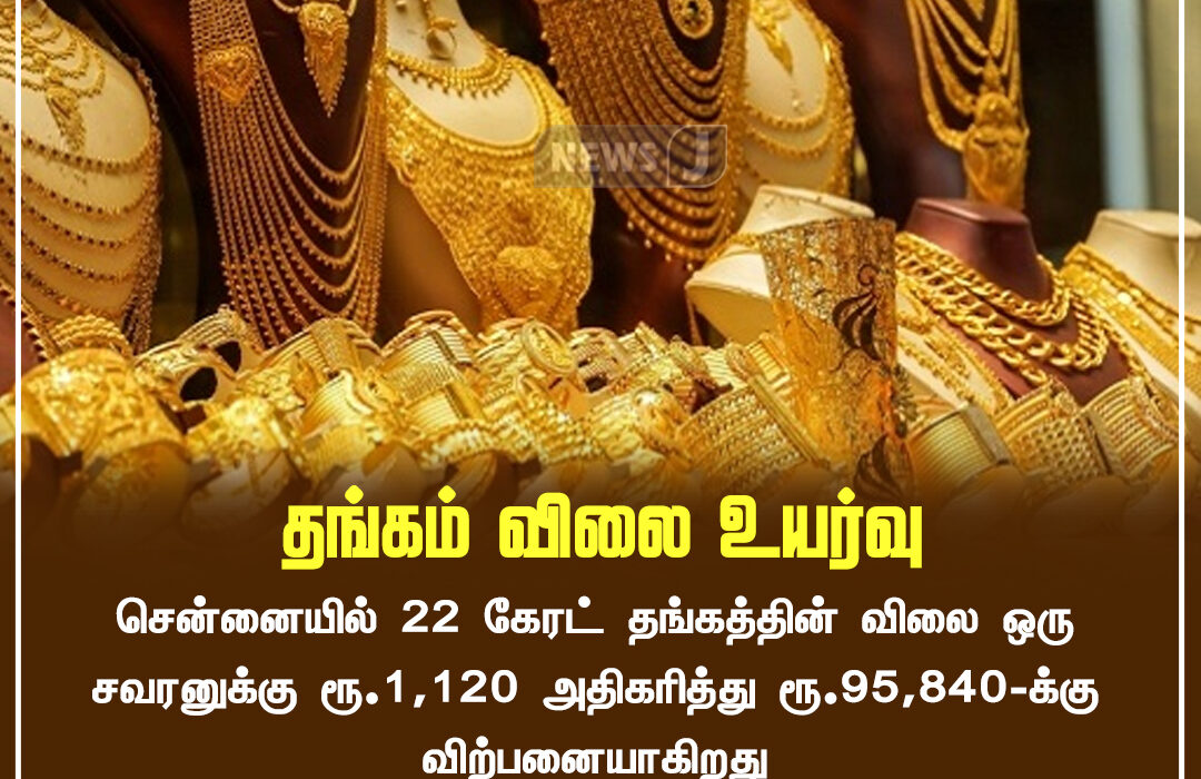 சென்னையில் 22 கேரட் தங்கத்தின் விலை இன்று மேலும் உயர்ந்துள்ளது. ஒரு சவரனுக்கு ரூ.1,120 அதிகரித்து ரூ.95,840 என புதிய உயரத்தை எட்டியுள்ளது.
