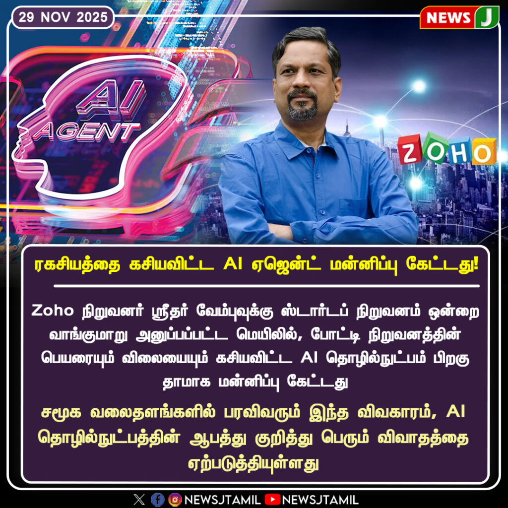 சென்னை, 29 நவம்பர் 2025 — Zoho நிறுவனர் ஸ்ரீதர் வேம்பு குறித்து சமூக வலைதளங்களில் பரவிய ஒரு பதிவில், நிறுவனத்தின் பணி விவரங்கள் மற்றும் வாடிக்கையாளர் தொடர்பான ரகசிய தகவல்கள் AI ஏஜென்ட் மூலம் கசியவிட்டதாக கூறப்பட்டதை நிறுவனம் மறுத்துள்ளது. பூரணமாக தவறான தகவல் எனவும், இது போலி பதிவாக இருப்பதாகவும் Zoho தெளிவுபடுத்தியுள்ளது.