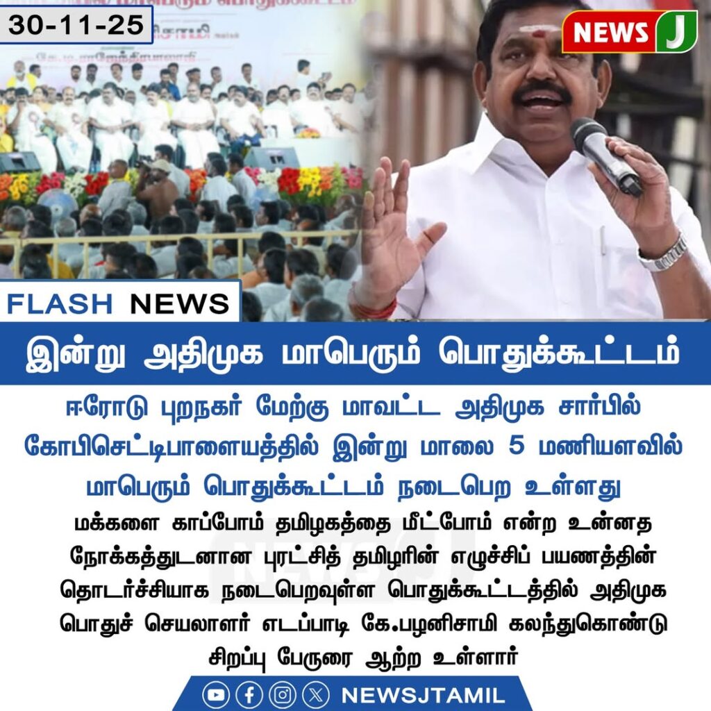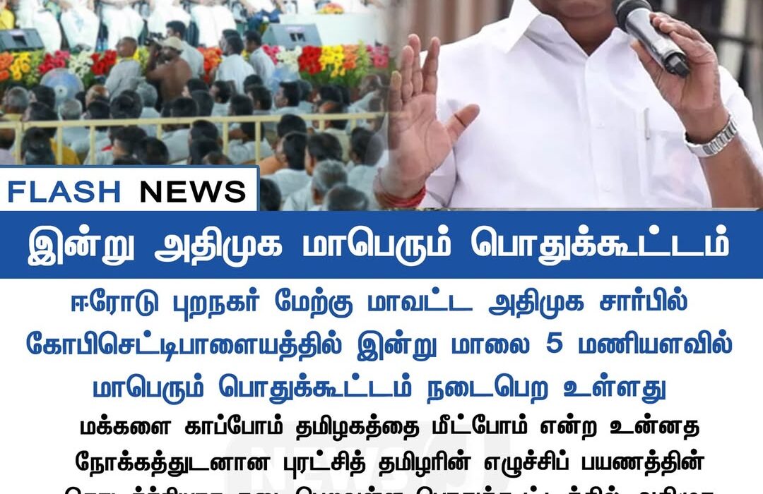 A large-scale AIADMK public meeting is scheduled today in Sembi, Erode district, starting at 5 PM. Party cadres have intensified preparations, expecting a massive turnout of supporters for the event.