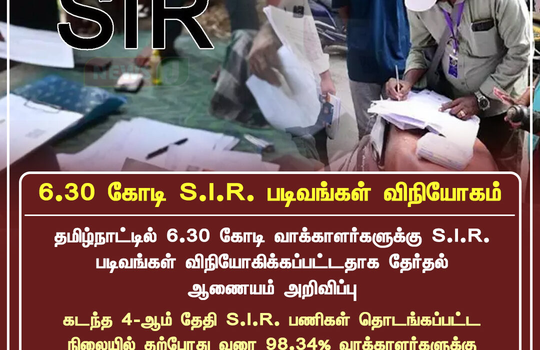 தமிழ்நாட்டில் 6.30 கோடி வாக்காளர்களுக்கான S.I.R. படிவங்கள் வெளியிடப்பட்டுள்ளதாக தேர்தல் ஆணையம் அறிவித்துள்ளது. மாநிலம் முழுவதும் வாக்காளர் தகவல் சரிபார்ப்பு மற்றும் புதுப்பிப்பு பணிகள் வேகமாக நடைபெற்று வருகின்றன.