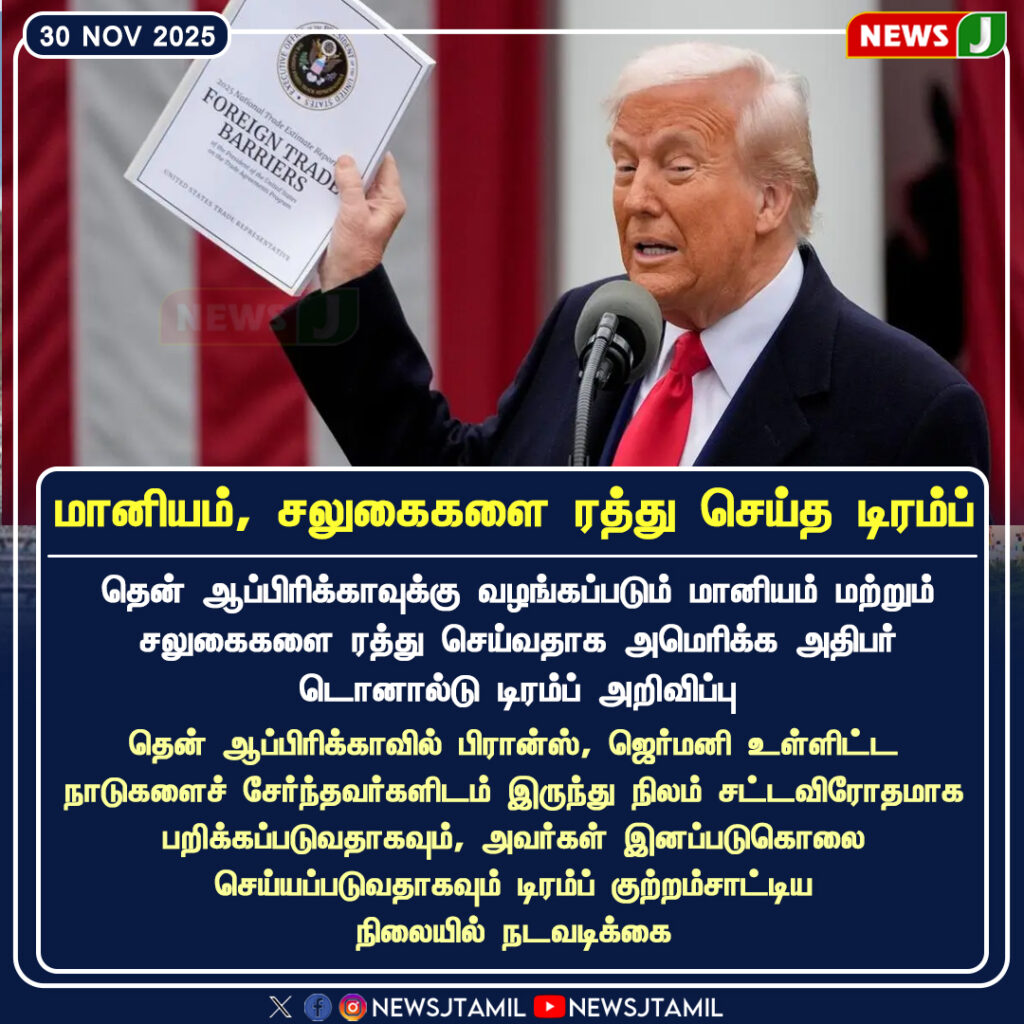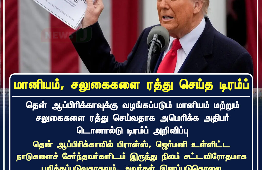 அமெரிக்க அதிபர் டொனால்ட் டிரம்ப், தென் ஆப்பிரிக்காவில் இருந்து வரும் பல பொருட்களுக்கு வழங்கப்பட்டிருந்த மானியமும் சலுகைகளையும் அதிகாரப்பூர்வமாக ரத்து செய்துள்ளது. அமெரிக்க சந்தையில் அநியாயமான வர்த்தக நிபந்தனைகள் காரணமாக இந்த முடிவு எடுக்கப்பட்டதாக டிரம்ப் தெரிவித்தார்.