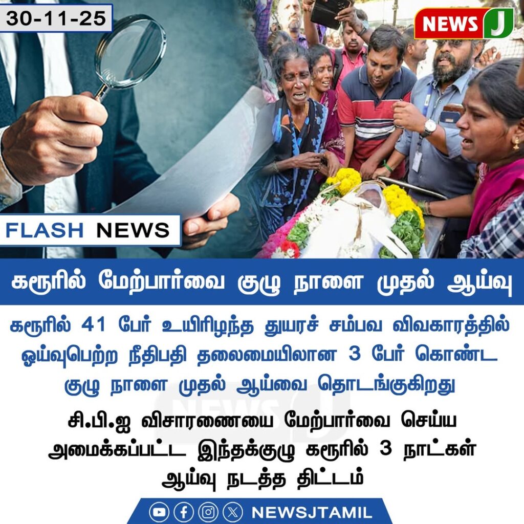 Following the tragic incident in Karur that claimed 41 lives, a three-member oversight committee formed under court directives will begin its first round of inspection tomorrow. The team will review administrative lapses, safety failures, and conduct field-level investigations.