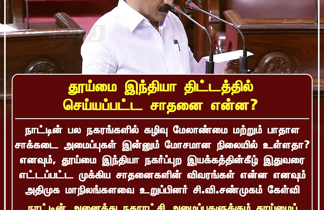 நாட்டின் பல நகரங்களில் குப்பை மேலாண்மை மற்றும் பாதாள சாக்கடை அமைப்புகள் இன்னும் மோசமான நிலையில் உள்ளதாக கூறி, தூய்மை இந்தியா நகைபுற இயக்கத்தின்கீழ் இதுவரை அடைந்த முக்கிய சாதனைகள் குறித்து விளக்கம் கேட்கப்பட்டுள்ளன. இதுகுறித்து சட்டப்பேரவையில் அதிமுக மாரில வந்த கேள்வி அரசின் நடவடிக்கையை சுட்டிக்காட்டுகிறது.