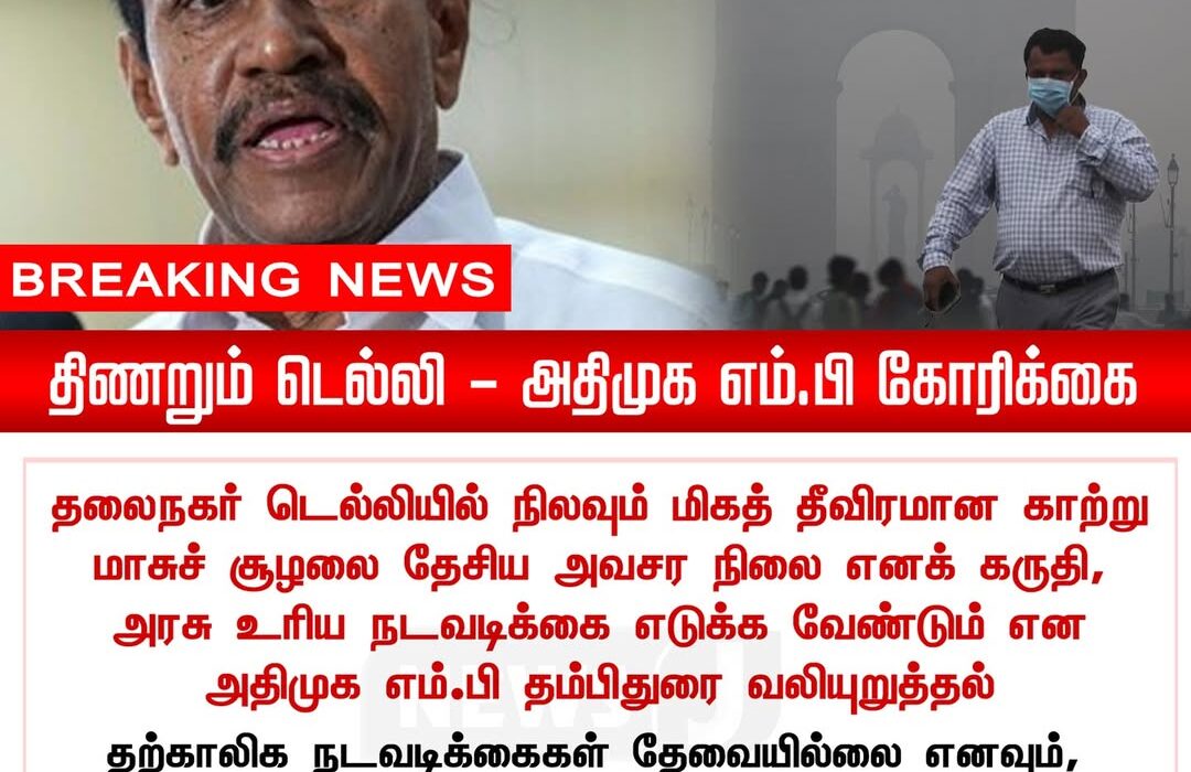 தலைநகர் டெல்லியில் நிலவும் மிகத் தீவிரமான காற்று மாசு சூழலை தேசிய அவசர நிலை எனக் கருதி, மத்திய அரசு உடனடி நடவடிக்கை எடுக்க வேண்டும் என அதிமுக எம்.பி தம்பிதுரை வலியுறுத்தியுள்ளார். மக்களின் உடல்நலத்துக்கு பெரும் ஆபத்தாக மாறிவரும் புகை மூட்டத்தால், நாடு முழுவதும் கவலை அதிகரித்து வருவதாக அவர் குறிப்பிட்டார்.