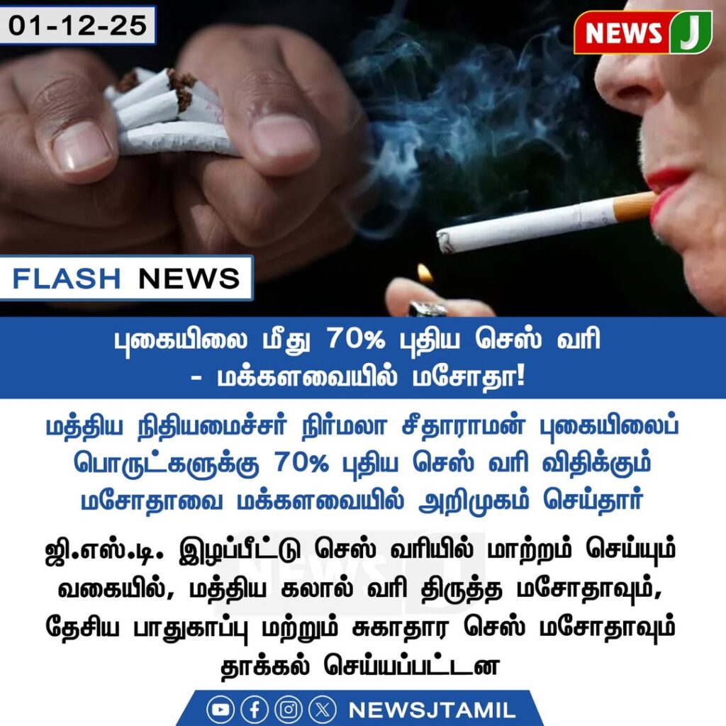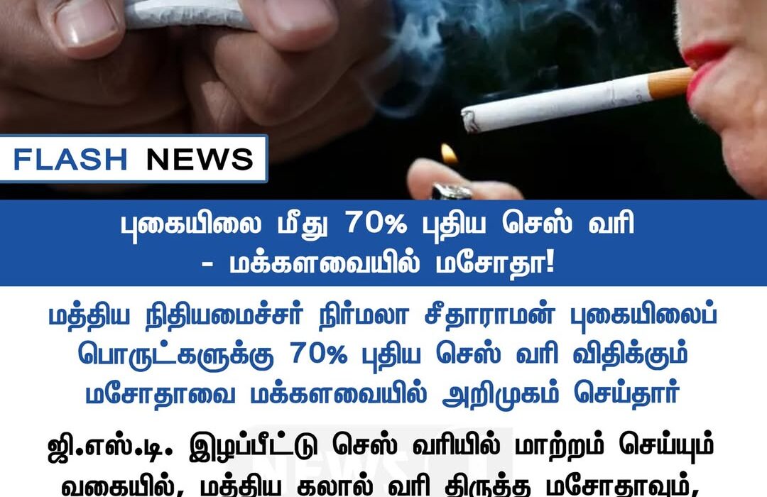 மத்திய நிதியமைச்சர் நிர்மலா சீதாராமன், புகையிலைப் பொருட்களுக்கு 70% புதிய செஸ் வரி விதிக்கப்படுவதாக மக்களவையில் அறிவித்துள்ளார்.