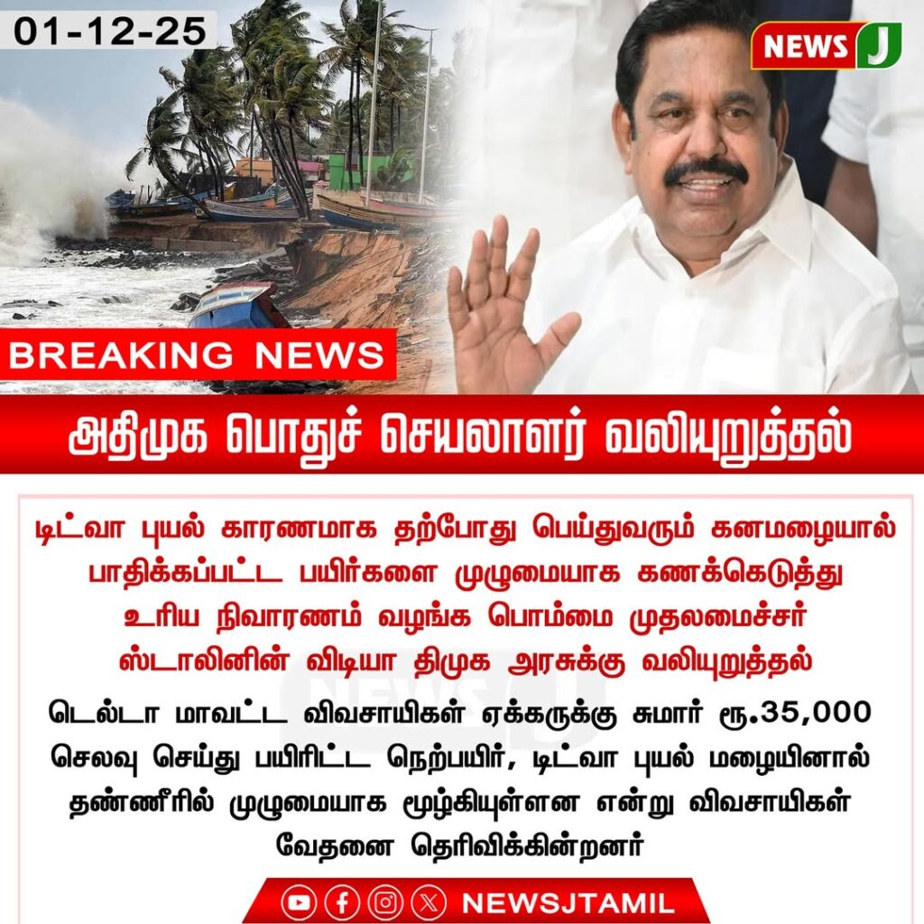 இந்த நிலையில், பாதிப்புக்குள்ளான மீனவர்களுக்கு முழுமையாக நிவாரணம் வழங்க அரசு நடவடிக்கை எடுக்க வேண்டும் என அதிமுக பொதுச் செயலாளர் எடப்பாடி பழனிசாமி வலியுறுத்தினார்.