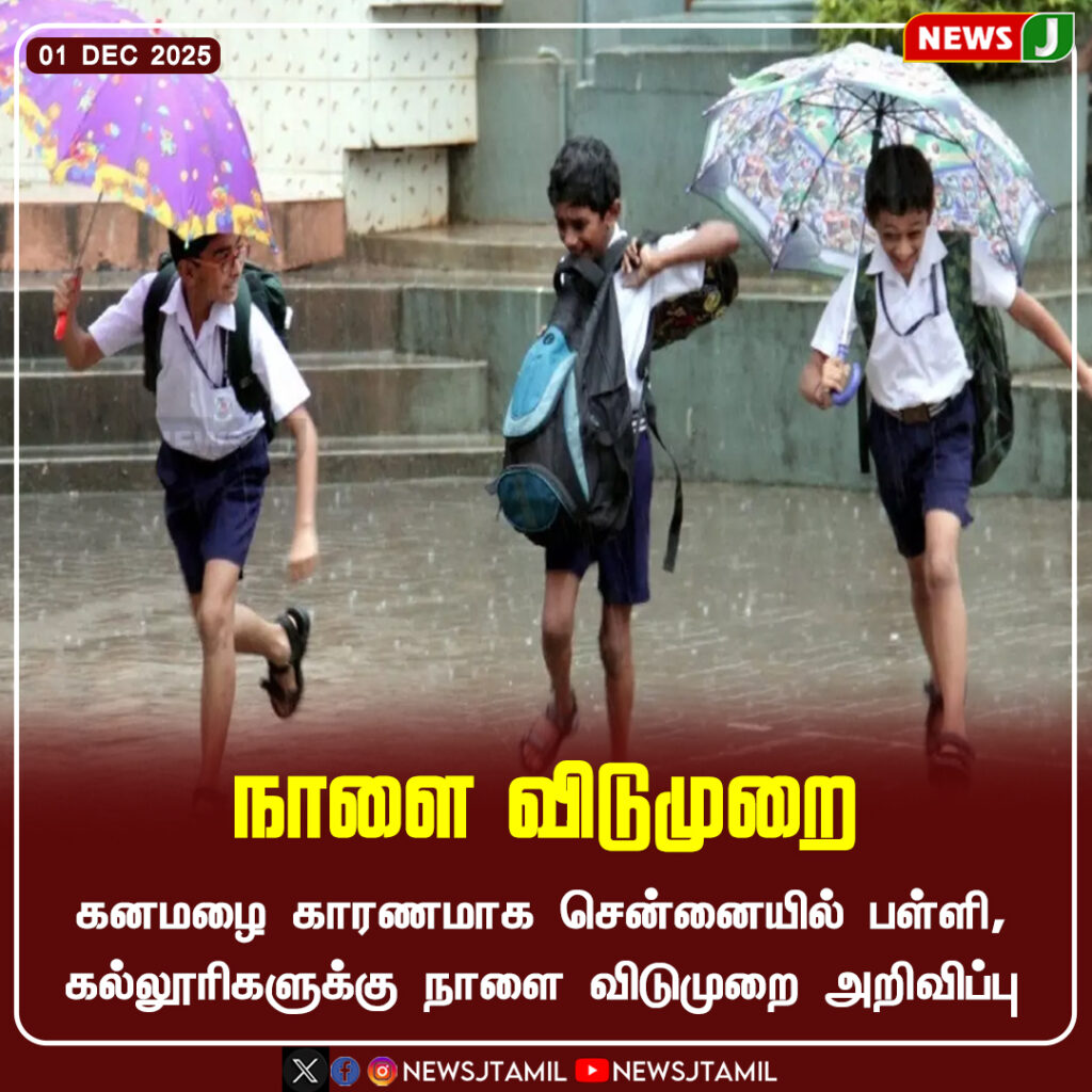 Due to continuous heavy rainfall across Chennai, several areas are experiencing waterlogging and transportation difficulties. In view of safety concerns, the government has declared a holiday tomorrow (December 2) for all schools and colleges in the city.